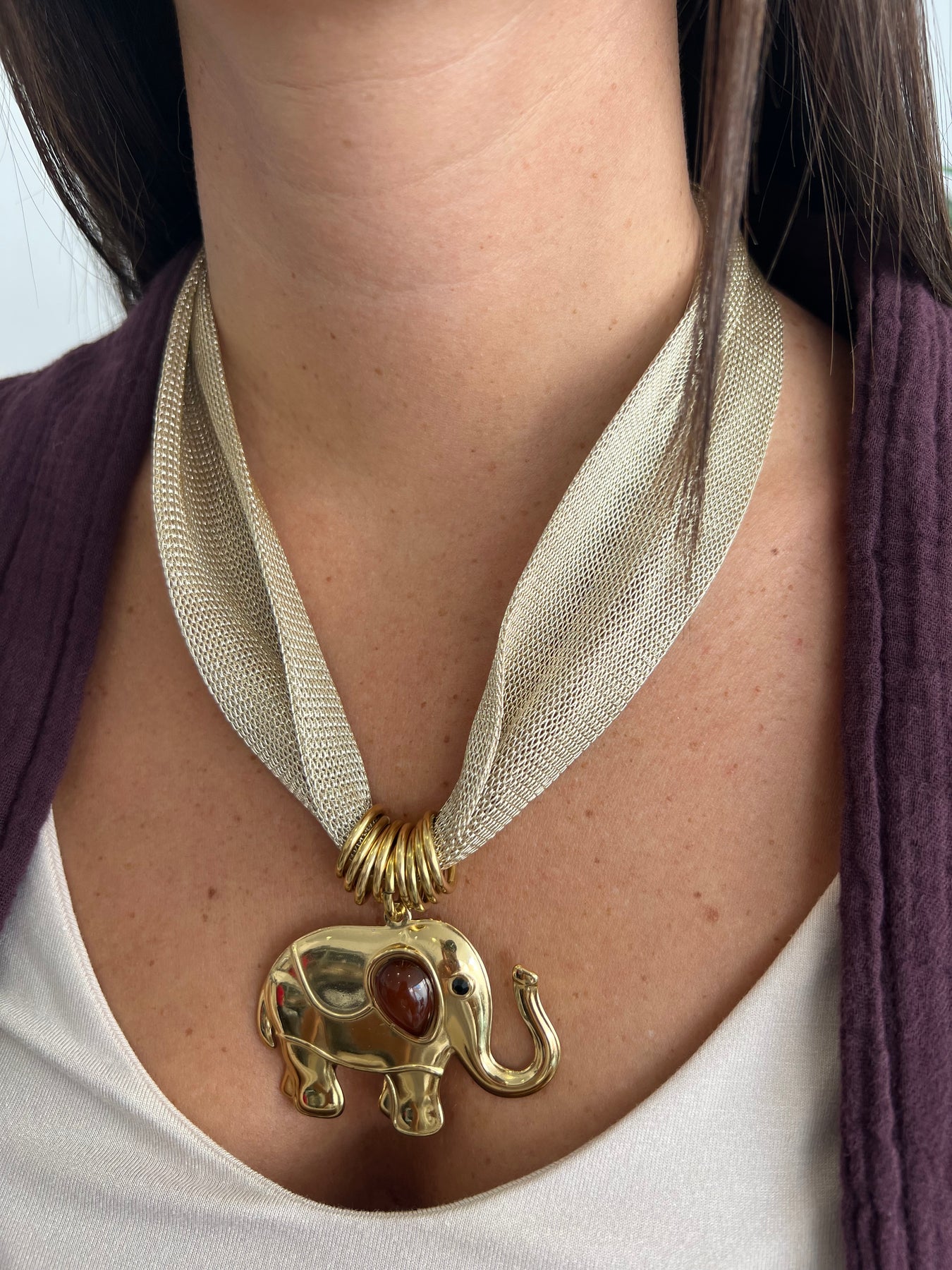 Un collar que habla por sí solo. Este diseño único combina una malla dorada ancha y ligera con un espectacular colgante de elefante, símbolo de fuerza, sabiduría y buena suerte. La pieza central está trabajada en acero dorado con acabado brillante e incorpora una piedra en tono ámbar que le da un toque cálido y elegante.