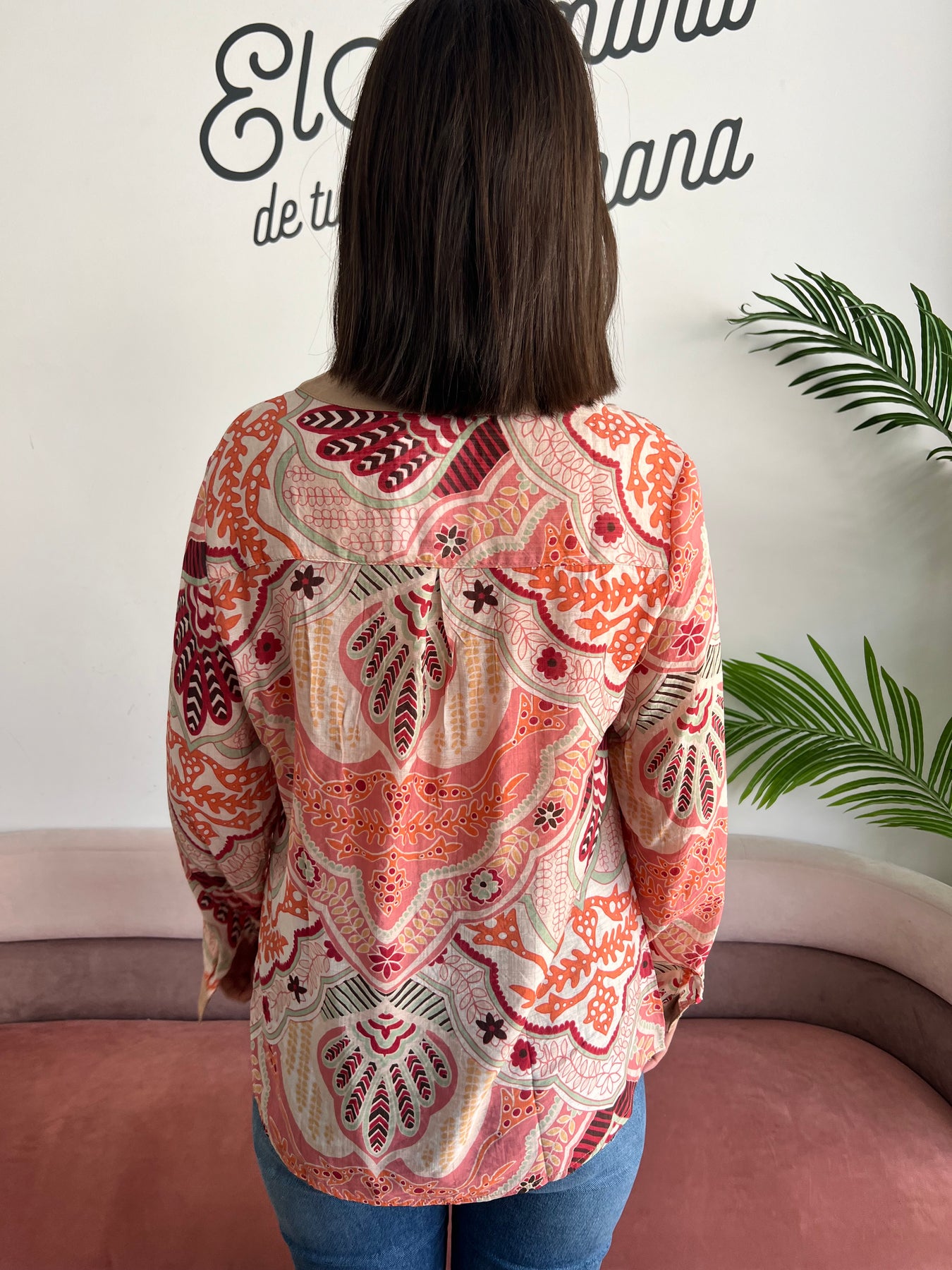 Blusa de inspiración boho con un precioso estampado en tonos cálidos que mezcla coral, rosa empolvado, beige y toques verdes, perfecta para dar luz y estilo a tus looks del día a día.