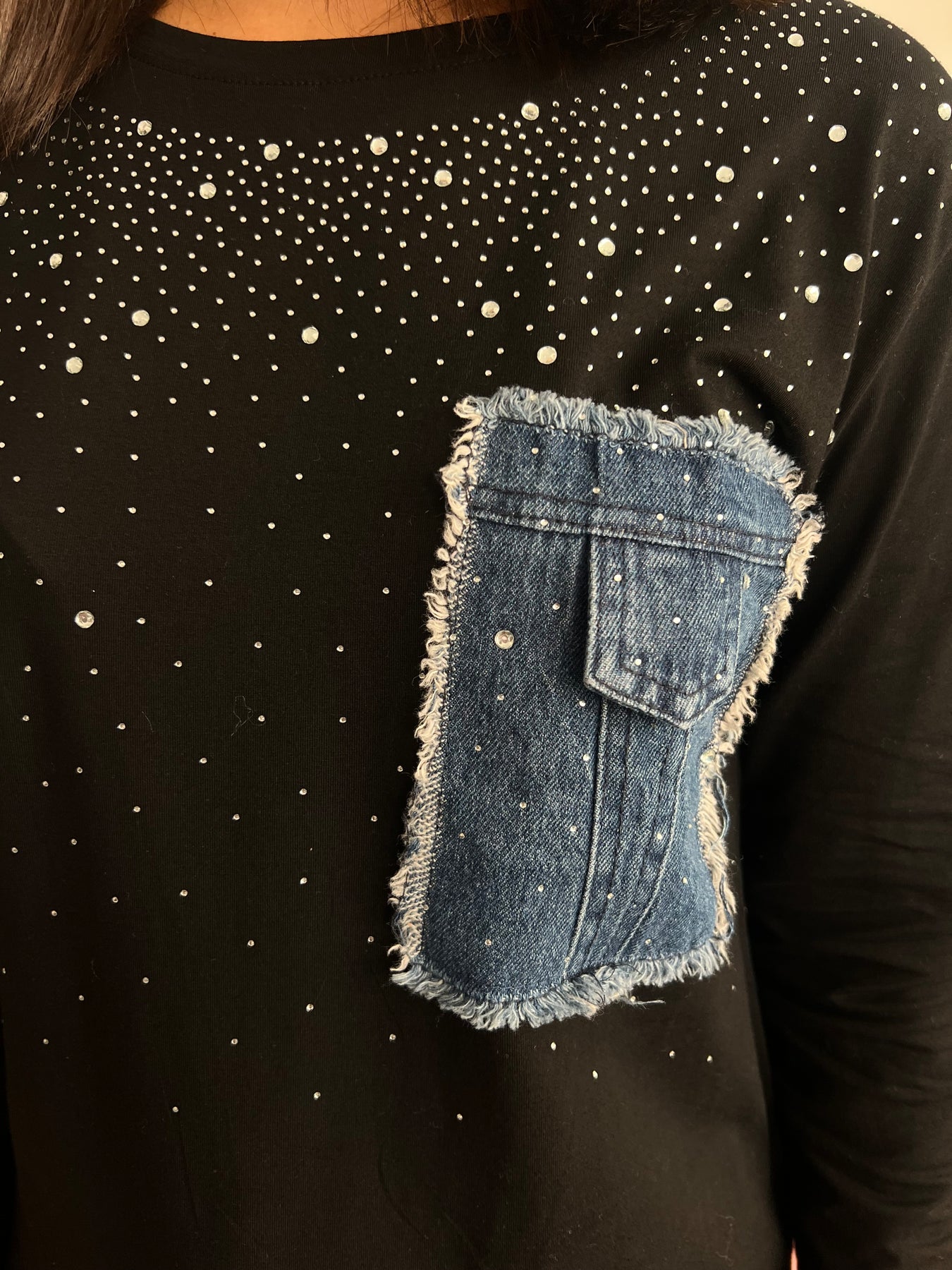 🔸 Bolsillo vaquero en el pecho con acabado desflecado