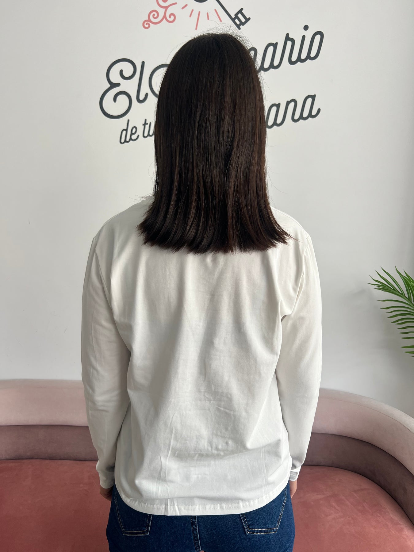¿Buscas una camiseta especial que eleve cualquier look sin perder comodidad? 💫 Esta prenda es todo lo que necesitas. De corte clásico y manga larga, tiene ese “algo” que la hace destacar: un delicado bordado azul marino con formas florales sobre el pecho y laterales, combinado con pequeños brillantes que captan la luz y llaman la atención sin ser excesivos 🌟