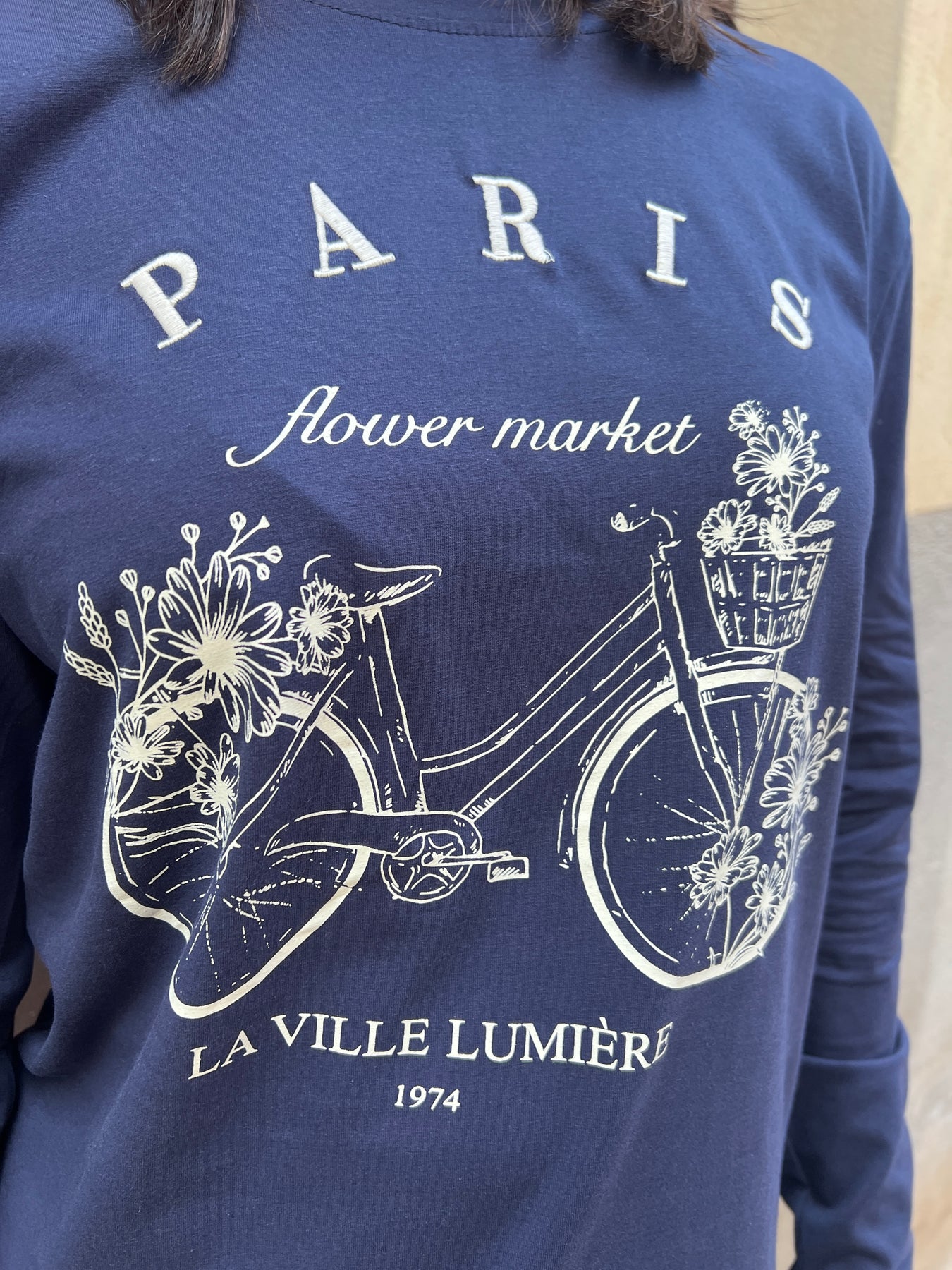 Si te gustan las prendas con rollazo parisino y ese toque romántico, esta camiseta es un acierto total 😍. De manga larga, en un azul marino precioso y con un diseño gráfico súper especial: una bicicleta vintage con flores y letras en estilo francés que dice “PARIS - La Ville Lumière” ✨