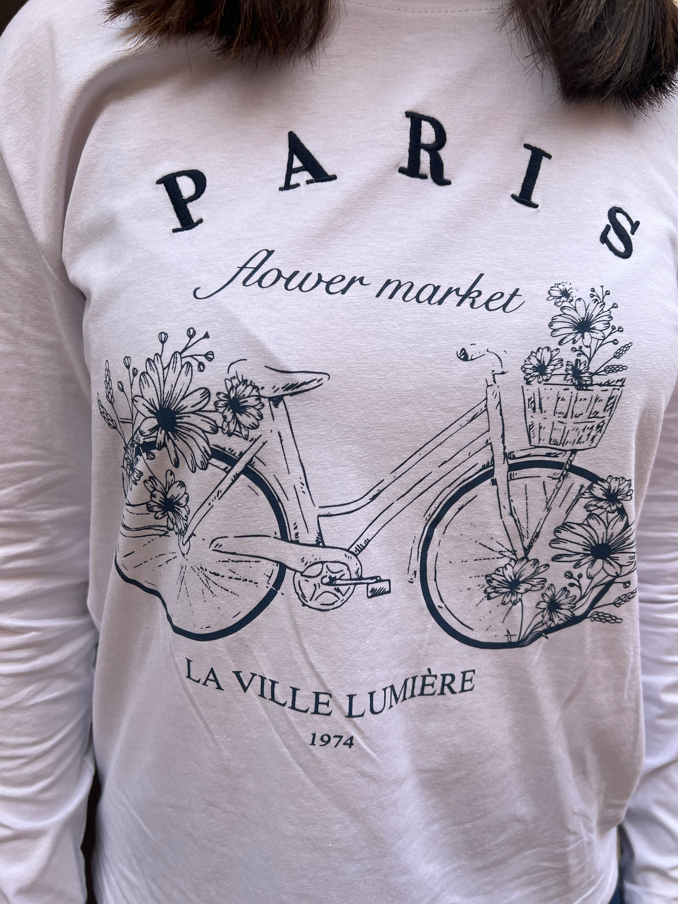 Si te gustan las prendas con rollazo parisino y ese toque romántico, esta camiseta es un acierto total 😍. De manga larga, en un azul marino precioso y con un diseño gráfico súper especial: una bicicleta vintage con flores y letras en estilo francés que dice “PARIS - La Ville Lumière” ✨