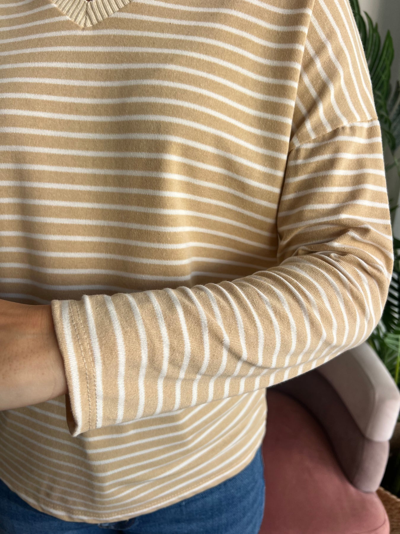 Camiseta de manga larga con cuello en pico y corte ligeramente suelto, súper cómoda y muy fácil de combinar. Tiene ese aire casual que queda ideal con vaqueros, pantalones más arreglados o incluso debajo de una chaqueta.