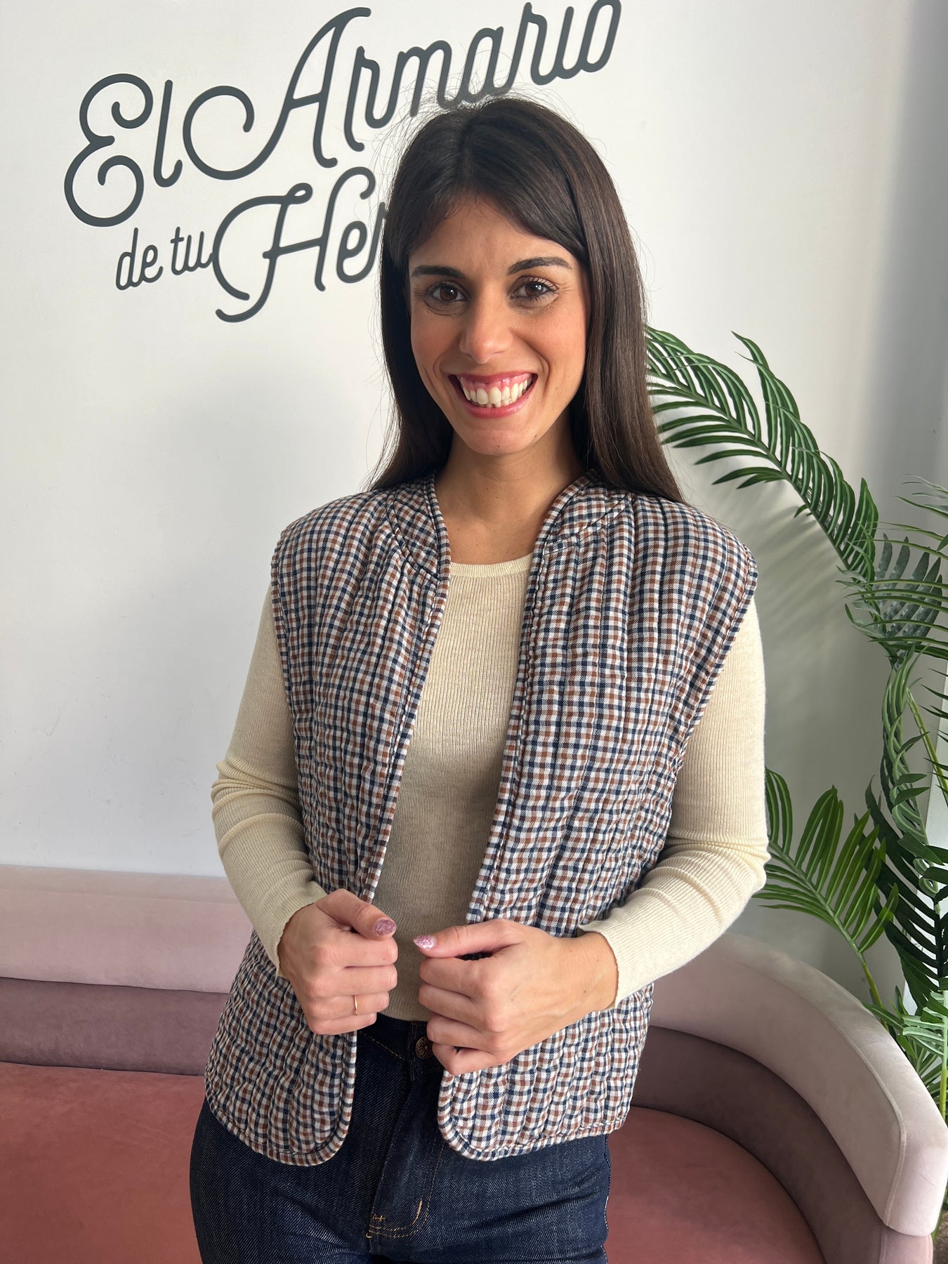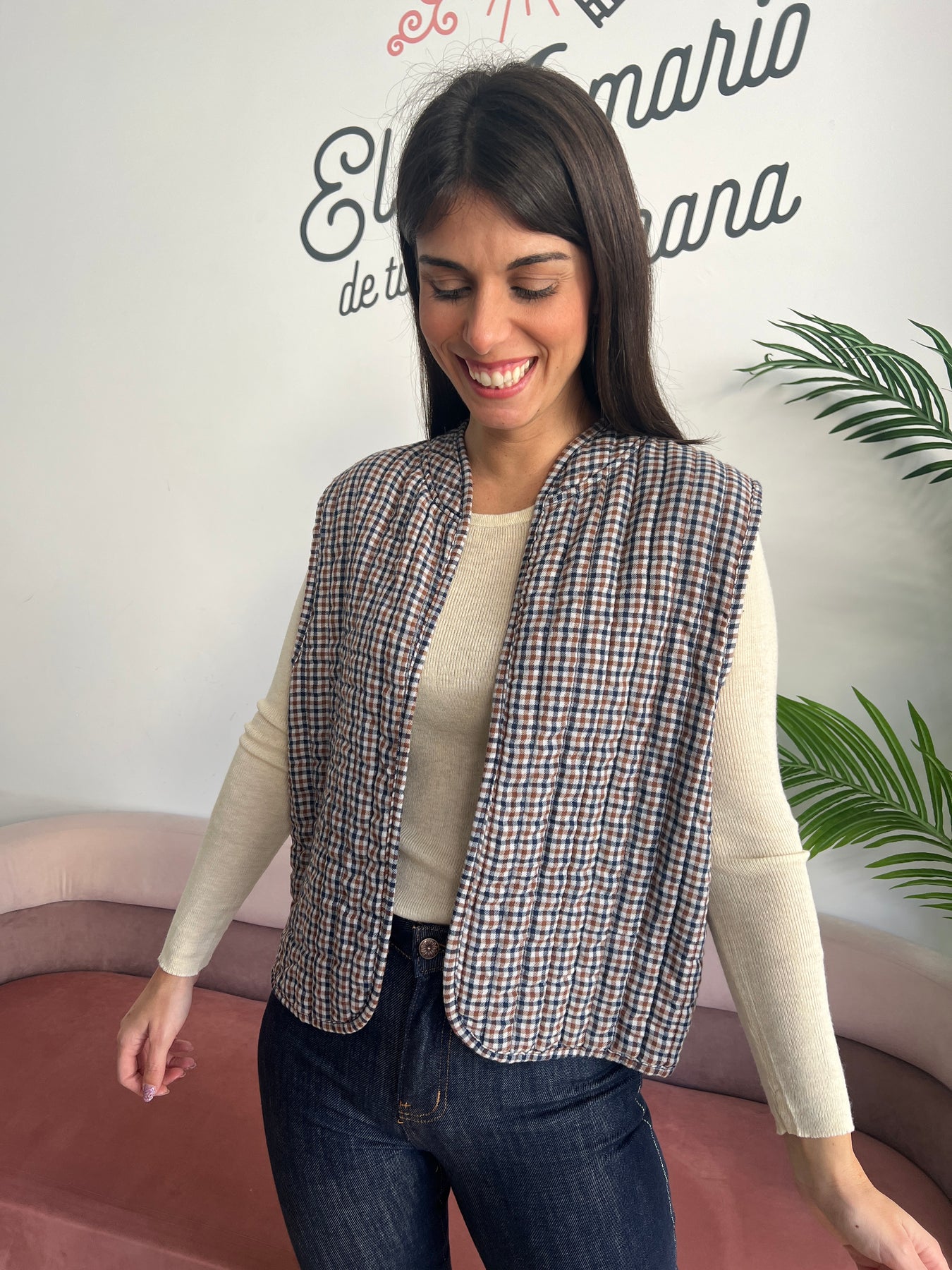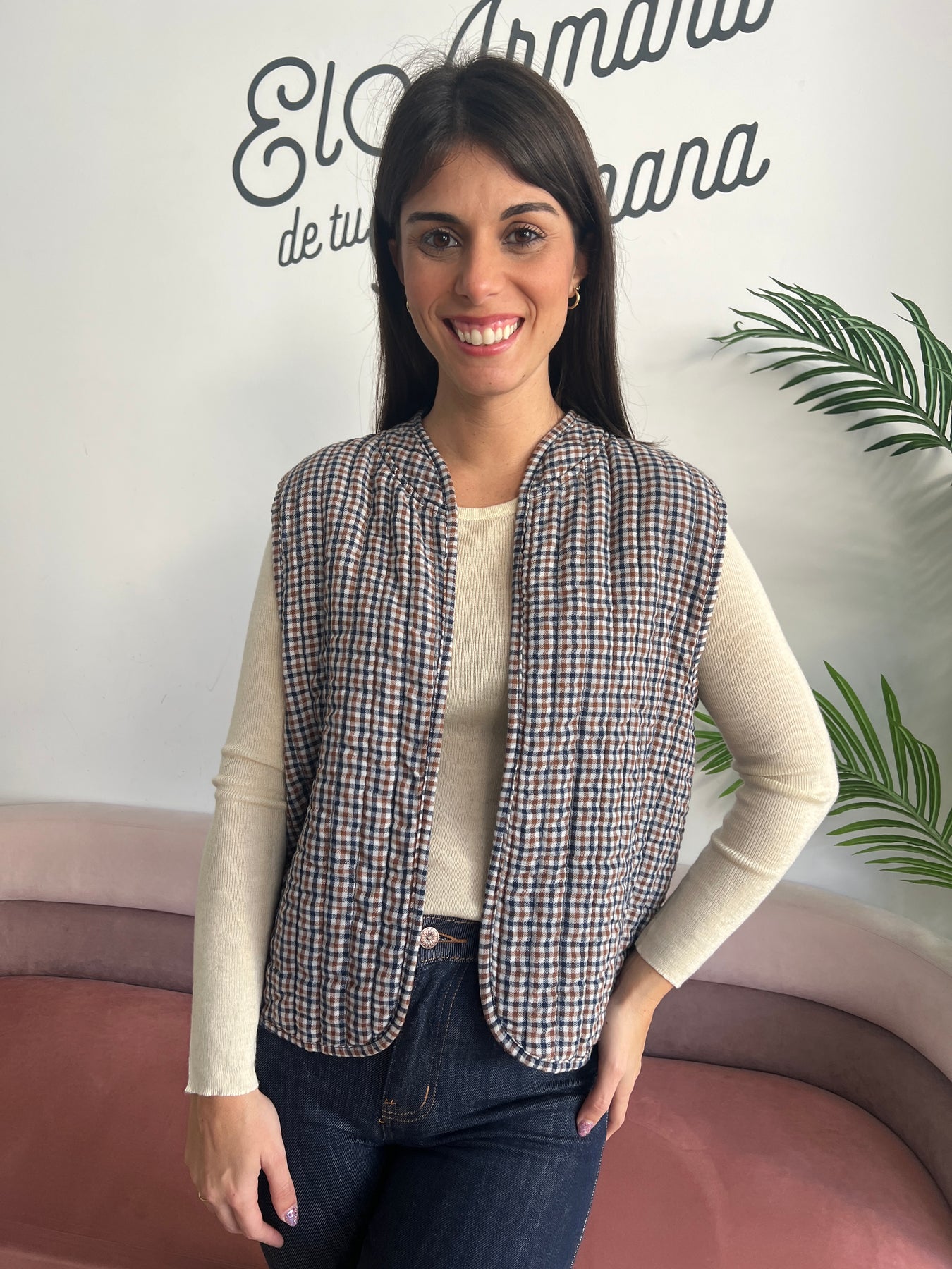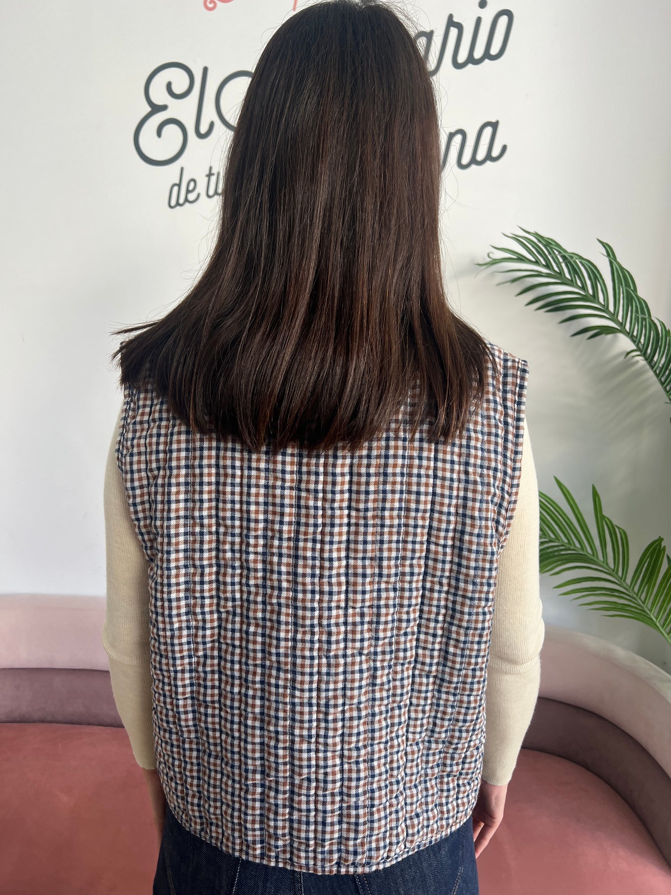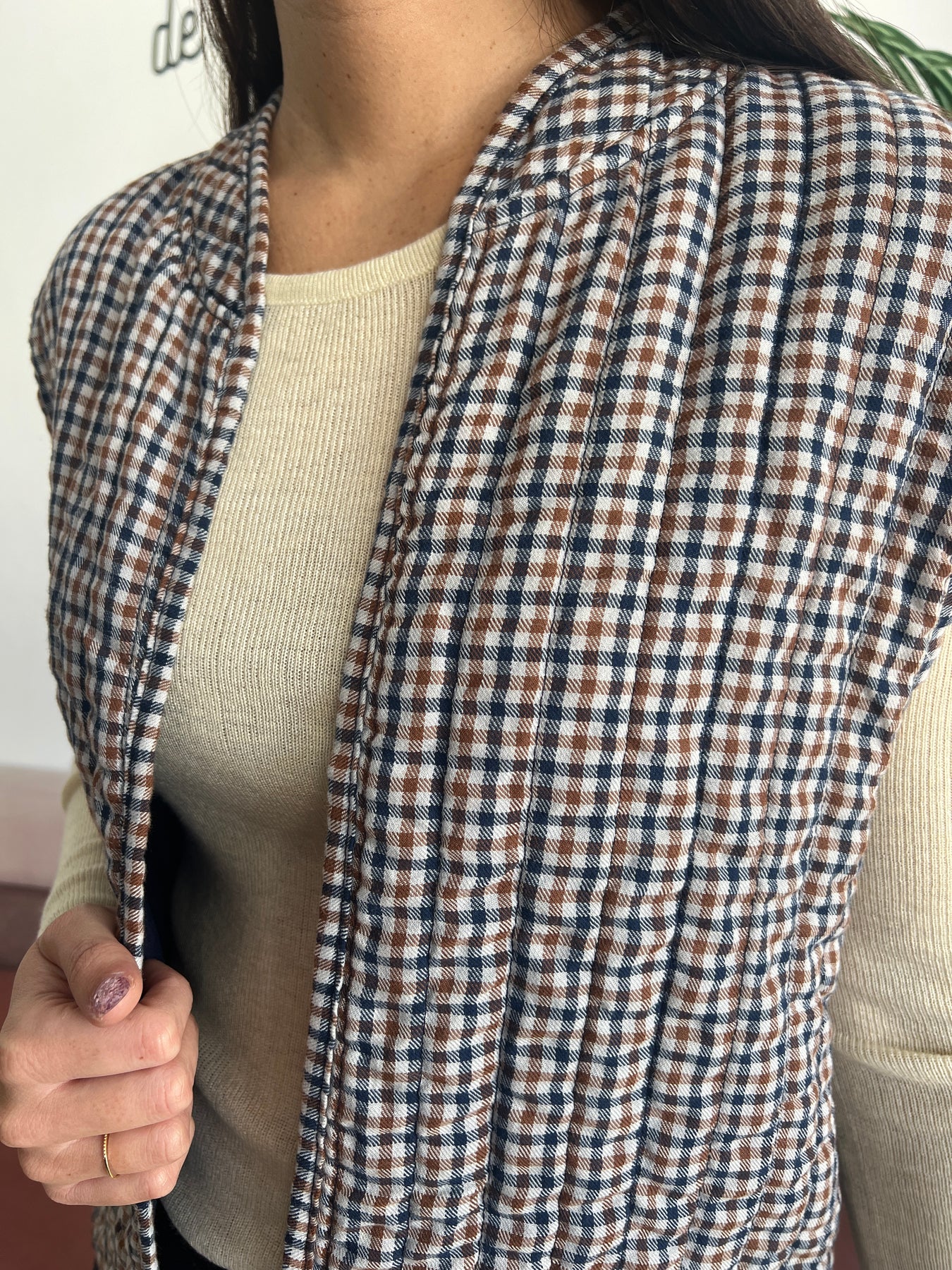 Tiene un diseño acolchado ligero con estampado de cuadros pequeños en tonos tierra (verde musgo, marrón y blanco), que le da un aire rústico y natural, muy en tendencia. Su cuello redondeado sin solapa y su estructura sin cierre le dan un toque relajado y cómodo, ideal para combinar con camisetas básicas, jerséis finitos o incluso camisas.
