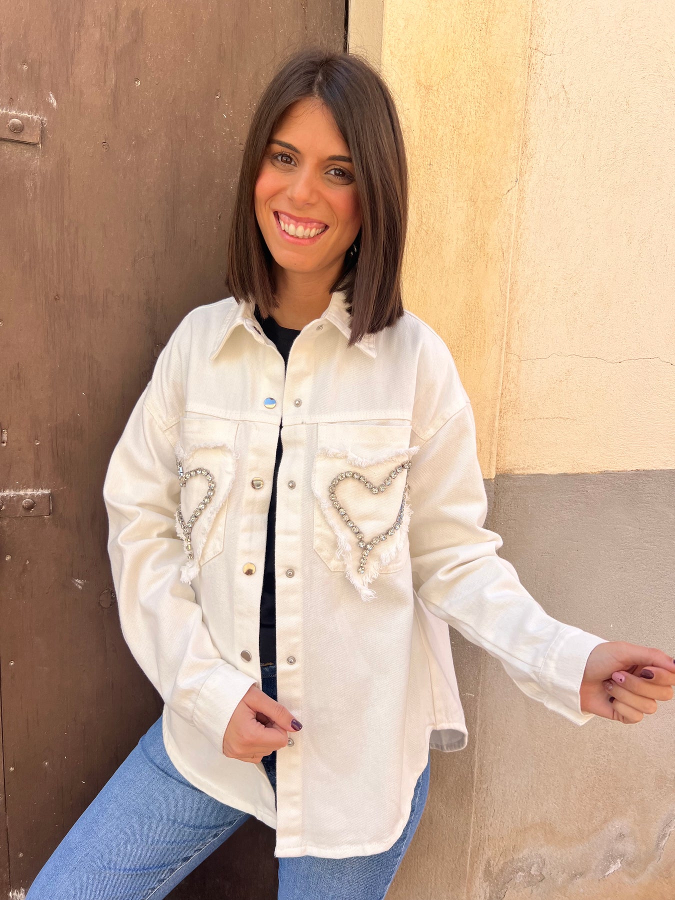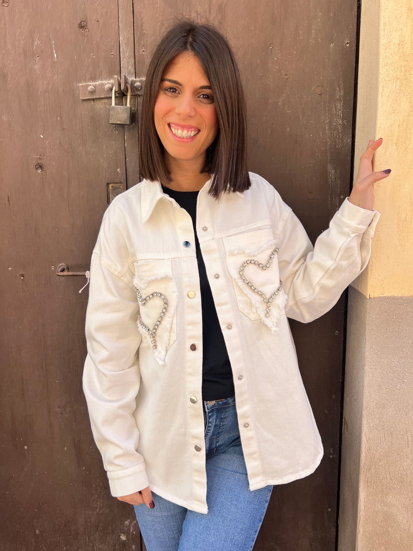 Una chaqueta vaquera muy especial que destaca por sus detalles de corazones con pedrería en los bolsillos delanteros, aportando un toque original y femenino que la convierte en una prenda diferente.
