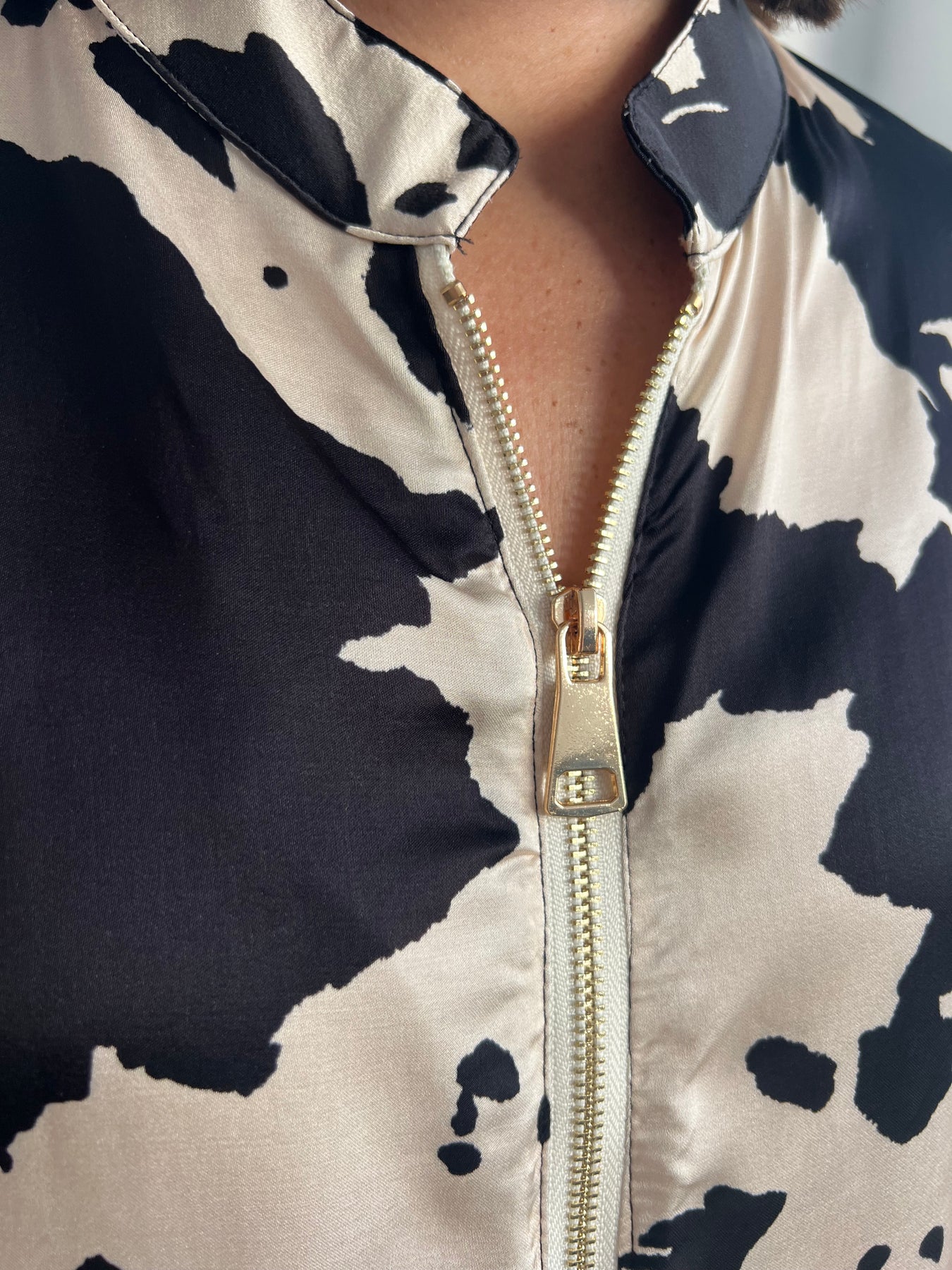 Tiene un diseño fluido y cómodo, con cierre frontal de cremallera que le da un aire más actual y versátil. El tejido tipo raso aporta ese brillo sutil que la hace diferente, perfecta tanto para el día a día como para darle un toque más arreglado a tus outfits.