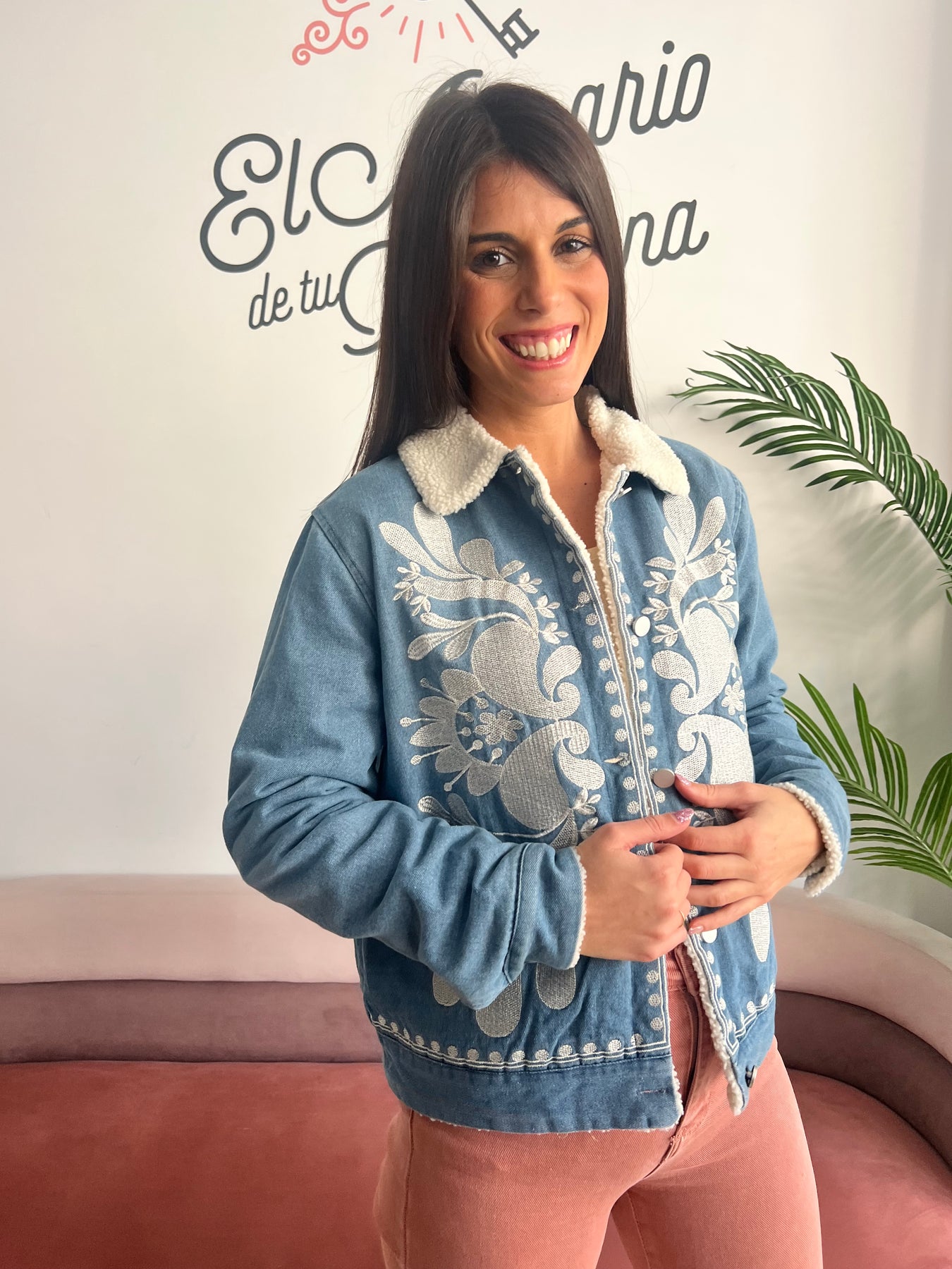 Abrigo tipo vaquero con un diseño que lo hace único y especial. Lleva bordados florales en la parte frontal que le dan un toque muy original y femenino 💫