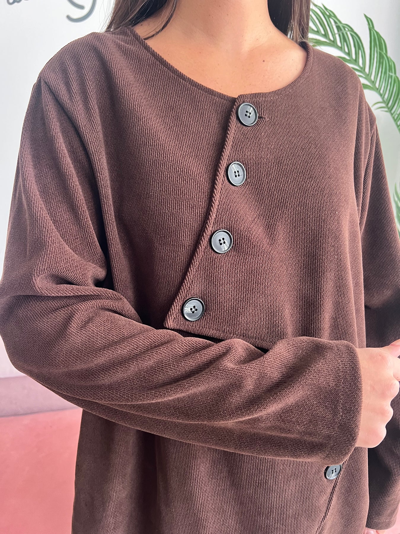 🧶 Está confeccionada en un tejido tipo canalé suave, gustoso y con caída, ideal para los días fresquitos de otoño e invierno. Además, su corte oversize y desenfadado permite llevarla con camisetas básicas, jerséis finos o incluso a modo de sobrecamisa.
