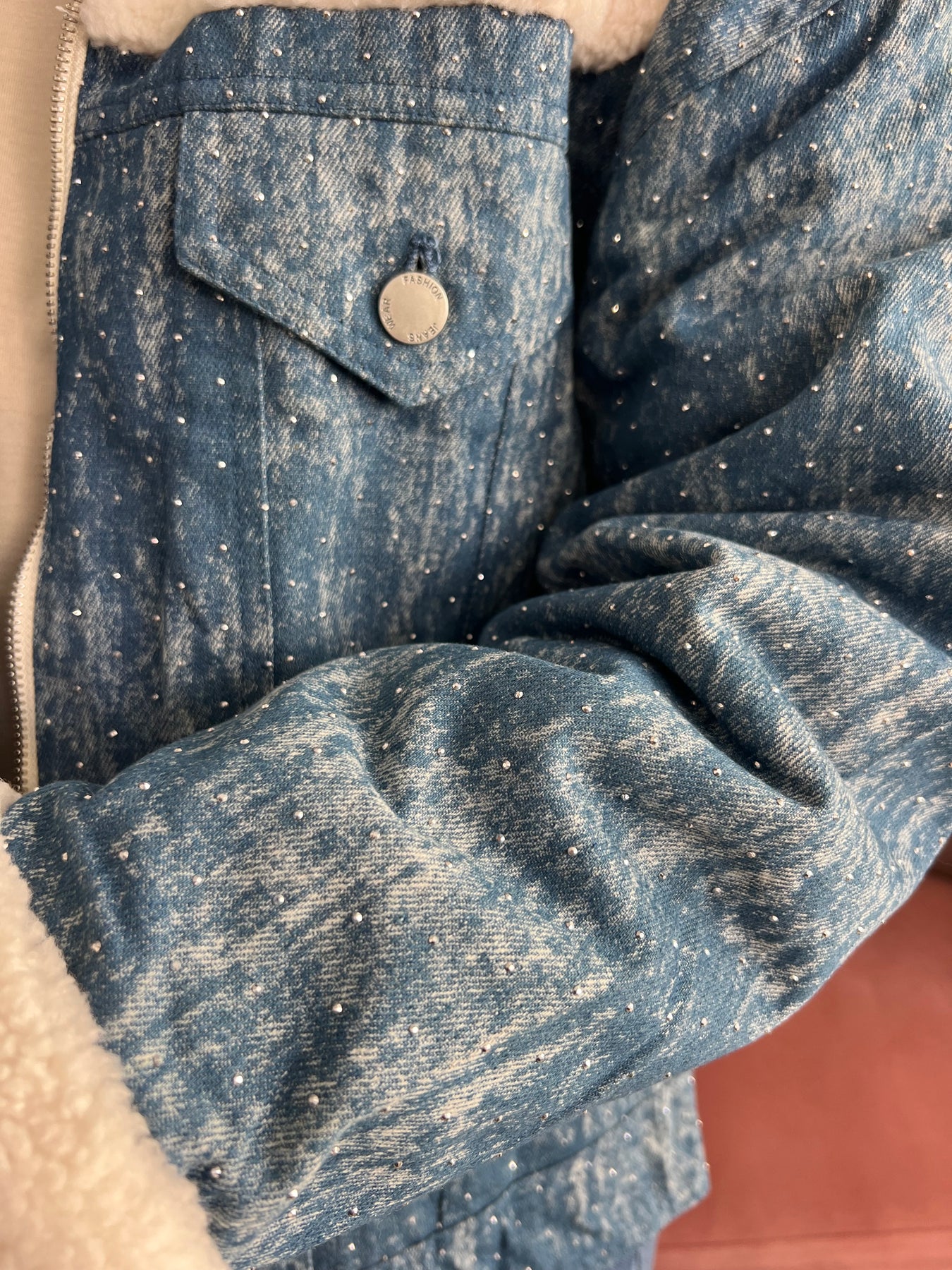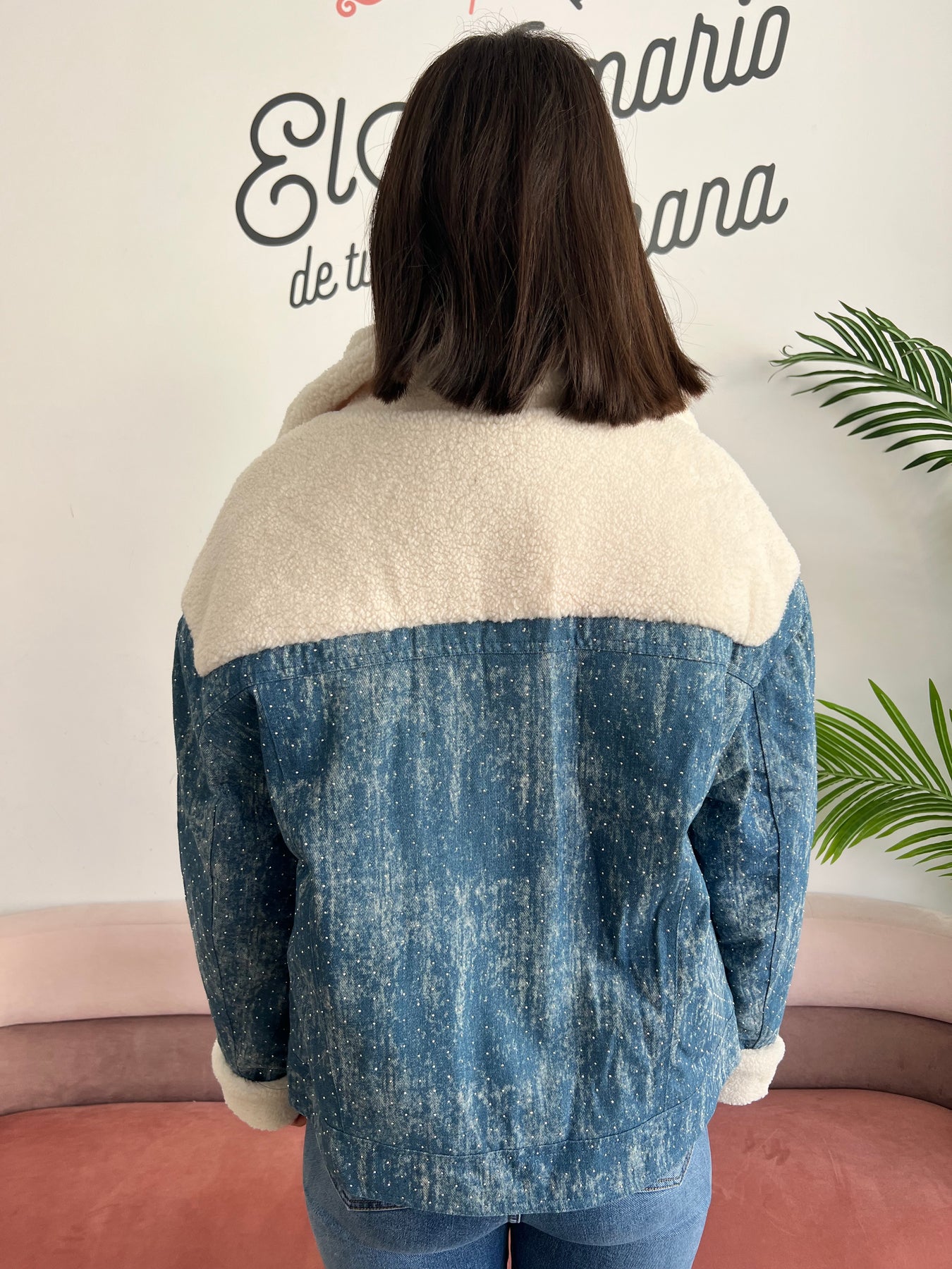 Chaqueta de estilo casual con un diseño muy especial que combina tejido tipo denim con pequeños detalles decorativos repartidos por toda la prenda, aportando un toque diferente y actual. Presenta cierre frontal con cremallera y bolsillos delanteros con solapa, prácticos y funcionales.