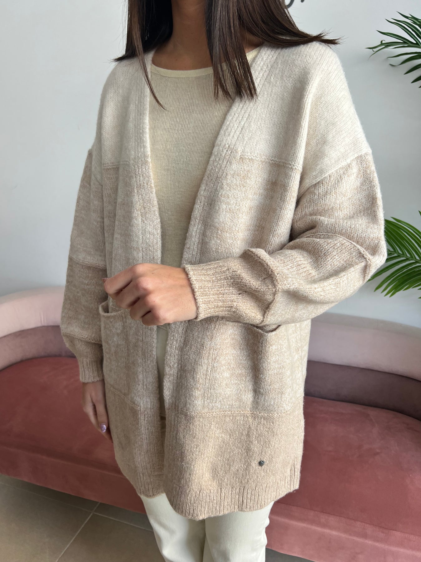 Una de esas prendas que aportan estilo sin esfuerzo 😍 Esta chaqueta de punto suave combina diferentes tonos en un efecto degradado precioso que le da un toque único y actual. Tiene un corte holgado y cómodo, con bolsillos delanteros funcionales y mangas ligeramente abullonadas con puño ajustado.