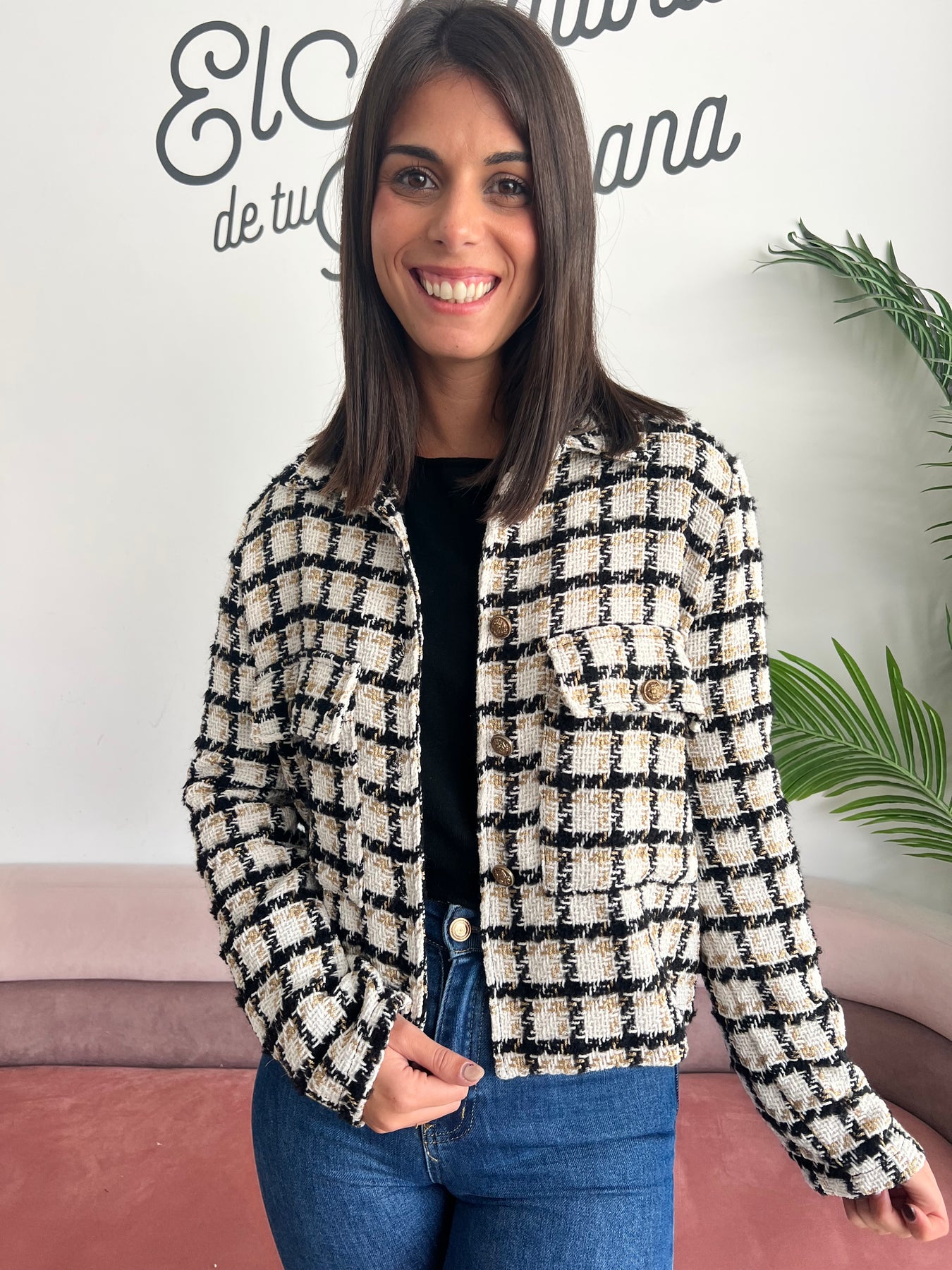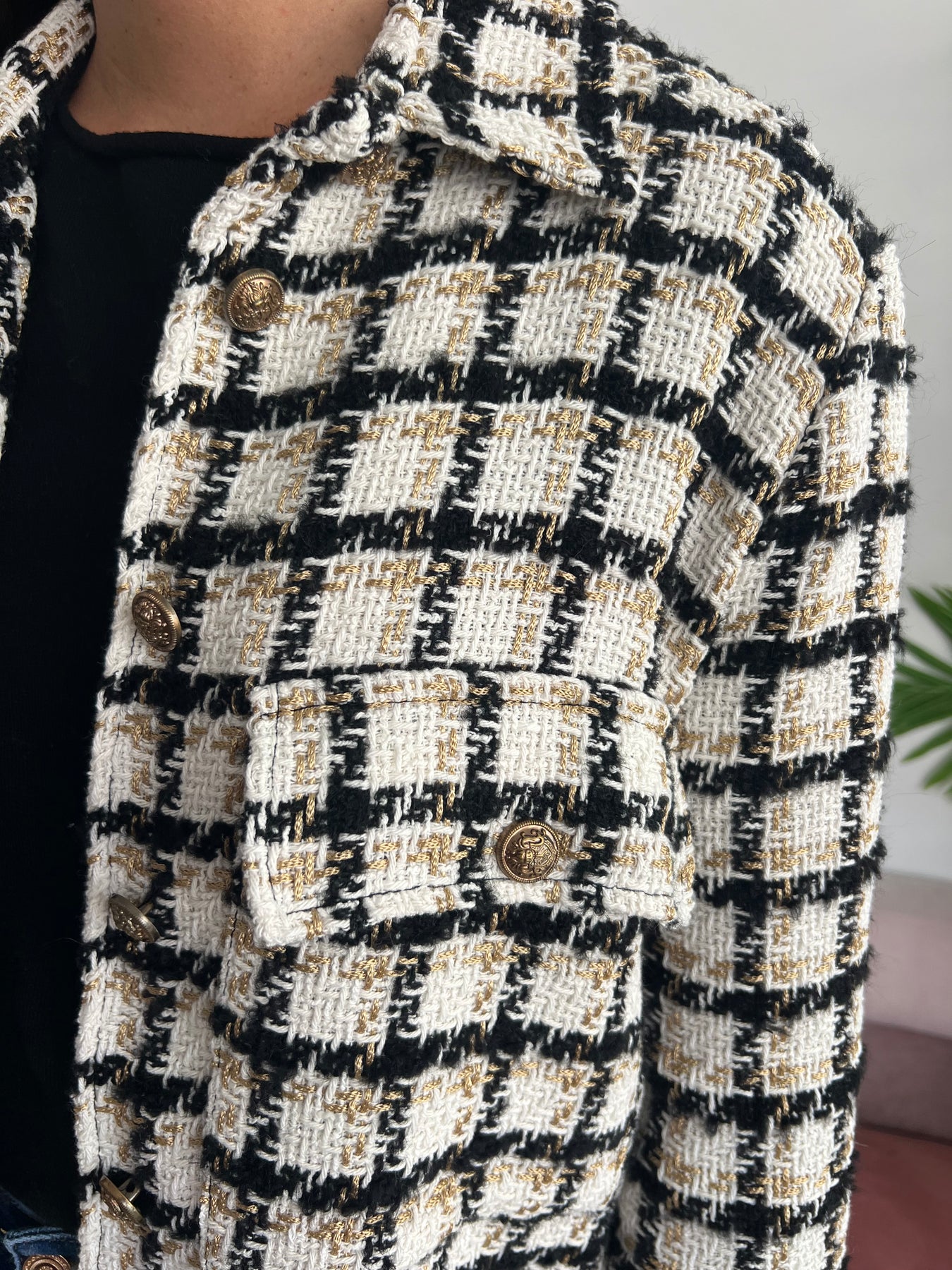 ✔️ Tejido tipo tweed con trama gruesa y hilo dorado metálico ✨ que aportan ese brillo sutil y elegante