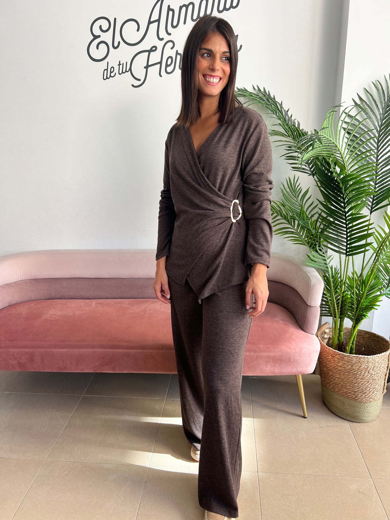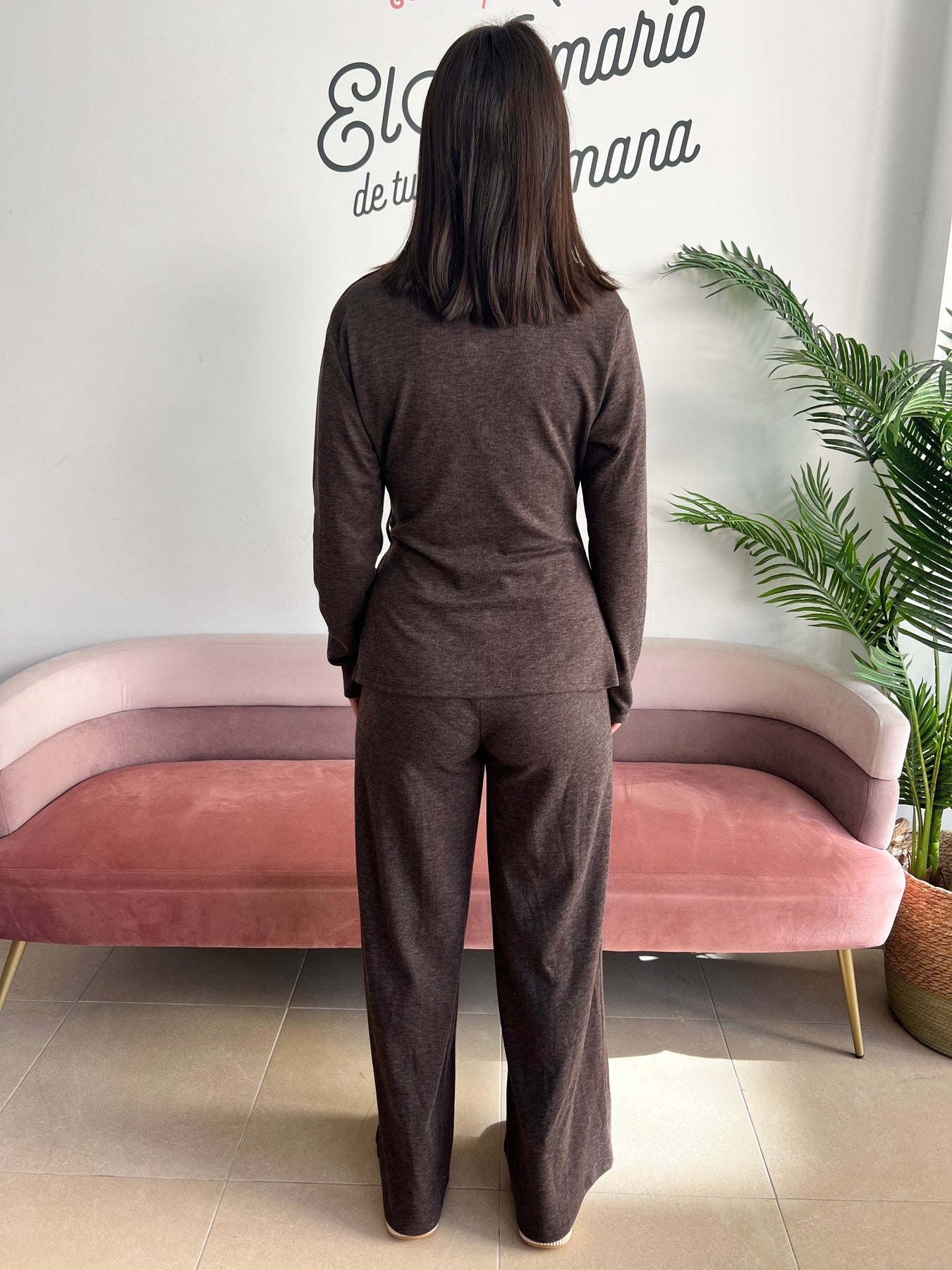 Este conjunto de punto en tono marrón chocolate combina elegancia con un rollazo relajado que se adapta a cualquier plan 👜☕