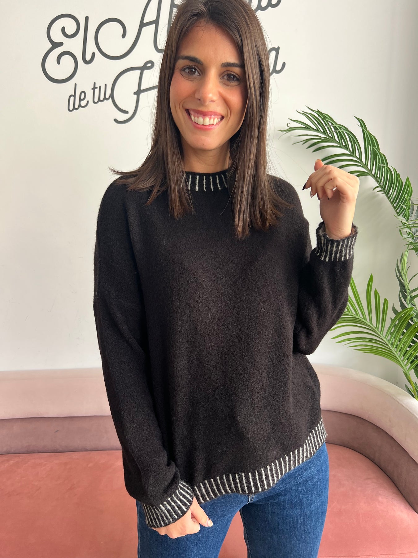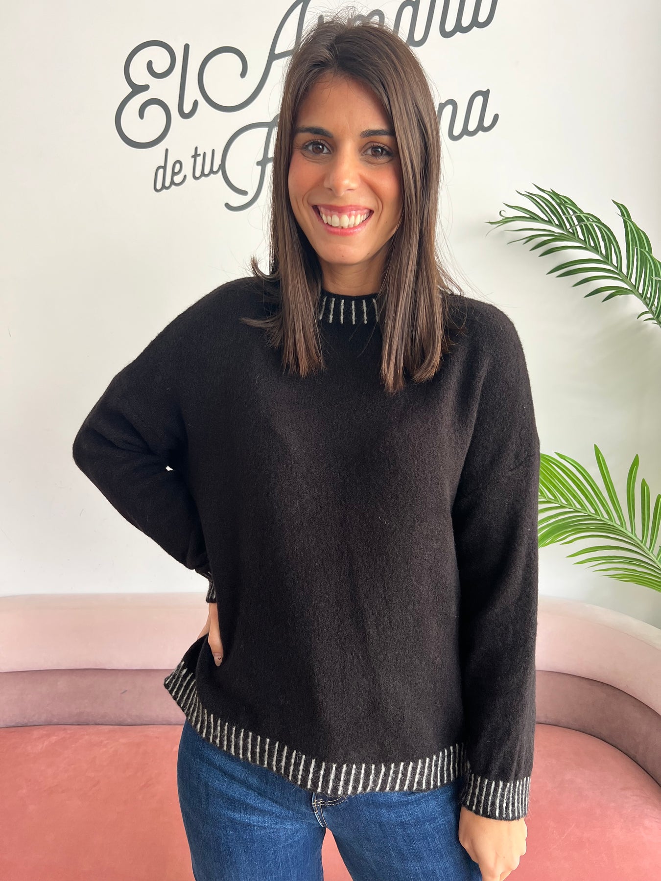 Este jersey es ese básico con chispa que no puede faltar en tu armario. Su color transmite calma y personalidad, mientras que los sutiles detalles de rayas en cuello, puños y bajo le dan un toque diferente y especial. ✨