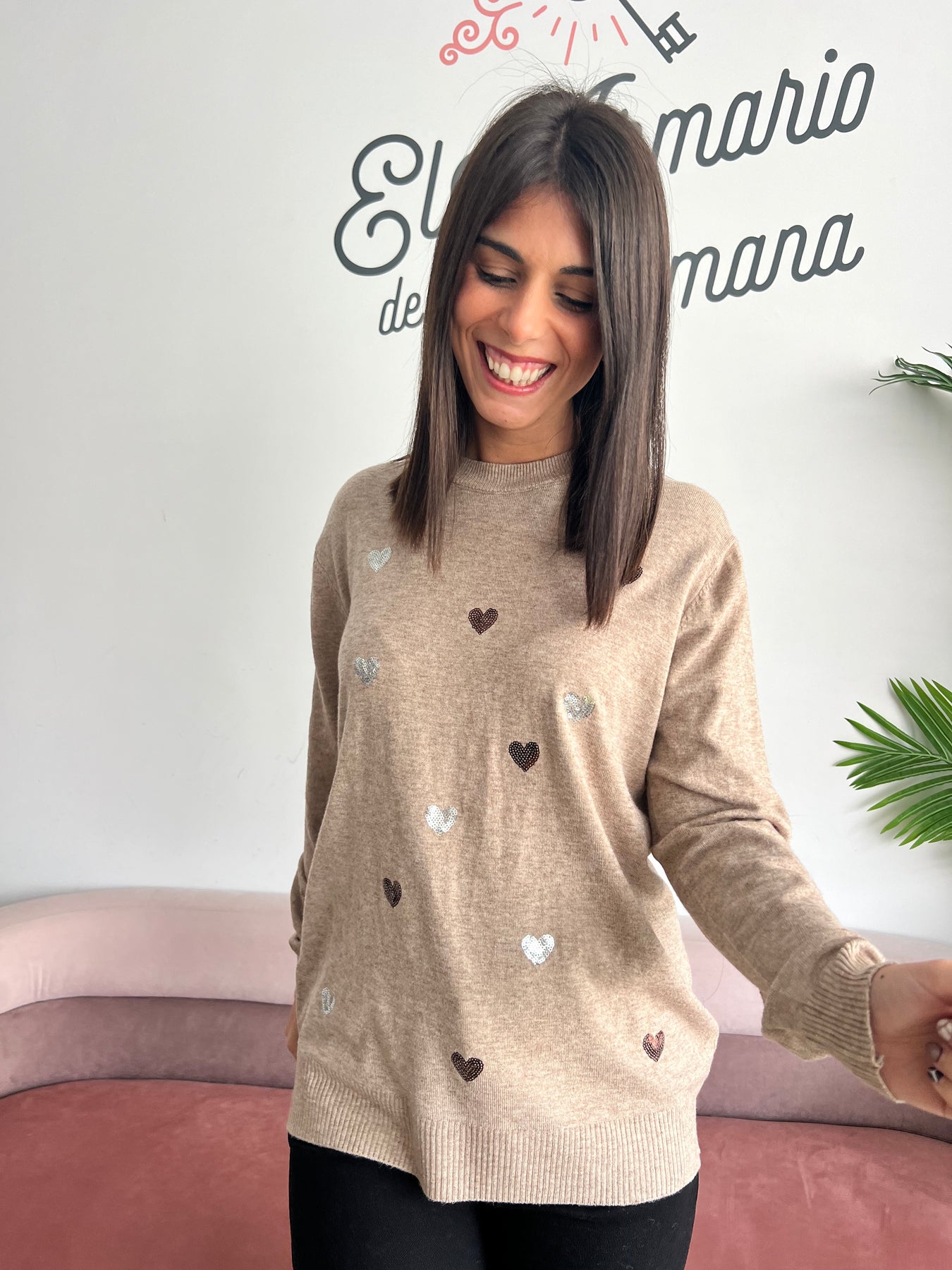 Si te gusta ir cómoda sin renunciar a un toque especial, este jersey te va a enamorar 💙. Su diseño está lleno de pequeños corazones bordados con lentejuelas, que le dan un brillo sutil y muy favorecedor. Es suave, amoroso y con el punto justo de originalidad para alegrar cualquier look.