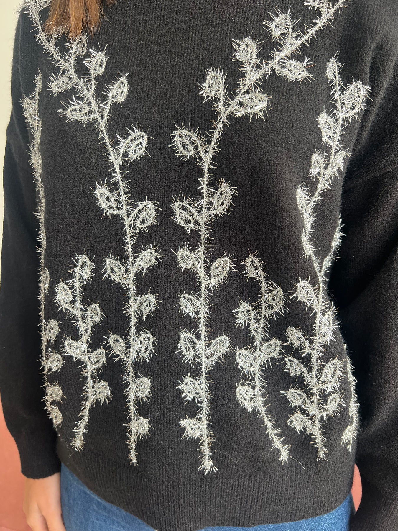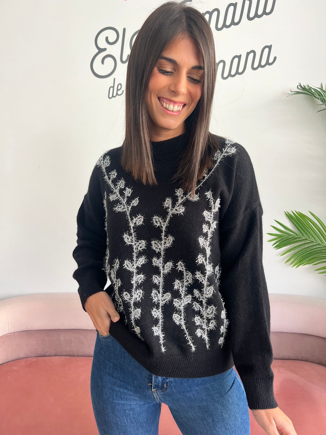 Este jersey de punto suave y calentito es una joya para tu armario. Su diseño con bordado metálico en forma de ramas y hojas no pasa desapercibido: aporta un aire femenino, diferente y con mucha personalidad 🌿💫