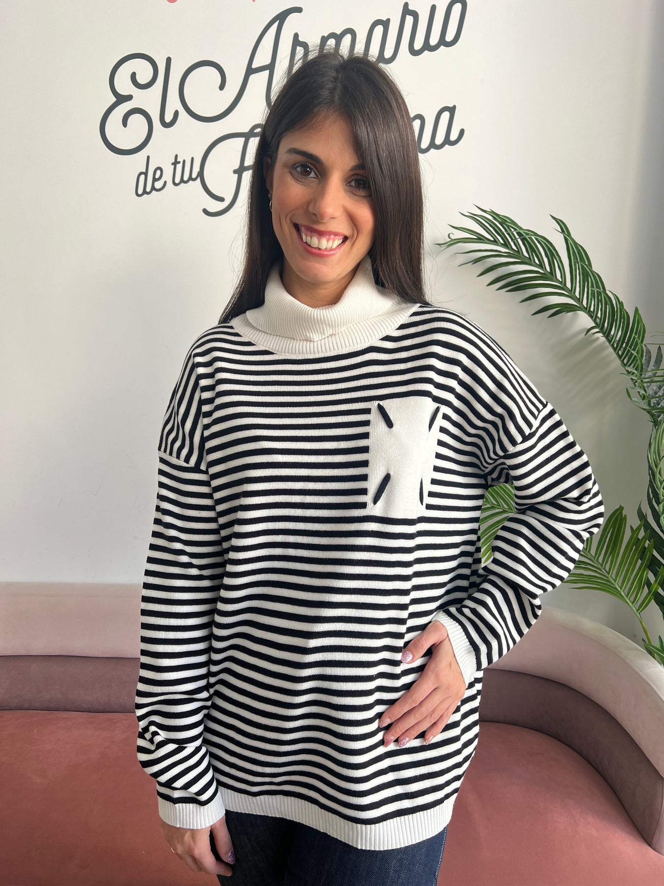 Su cuello vuelto, amplio y muy suave, aporta calidez y estilo, ideal para los días más frescos. El tejido es agradable al tacto, elástico y con buena caída, perfecto para usar tanto por dentro como por fuera del pantalón. Queda genial con vaqueros, faldas o incluso con leggings para un look cómodo y chic 🖤
