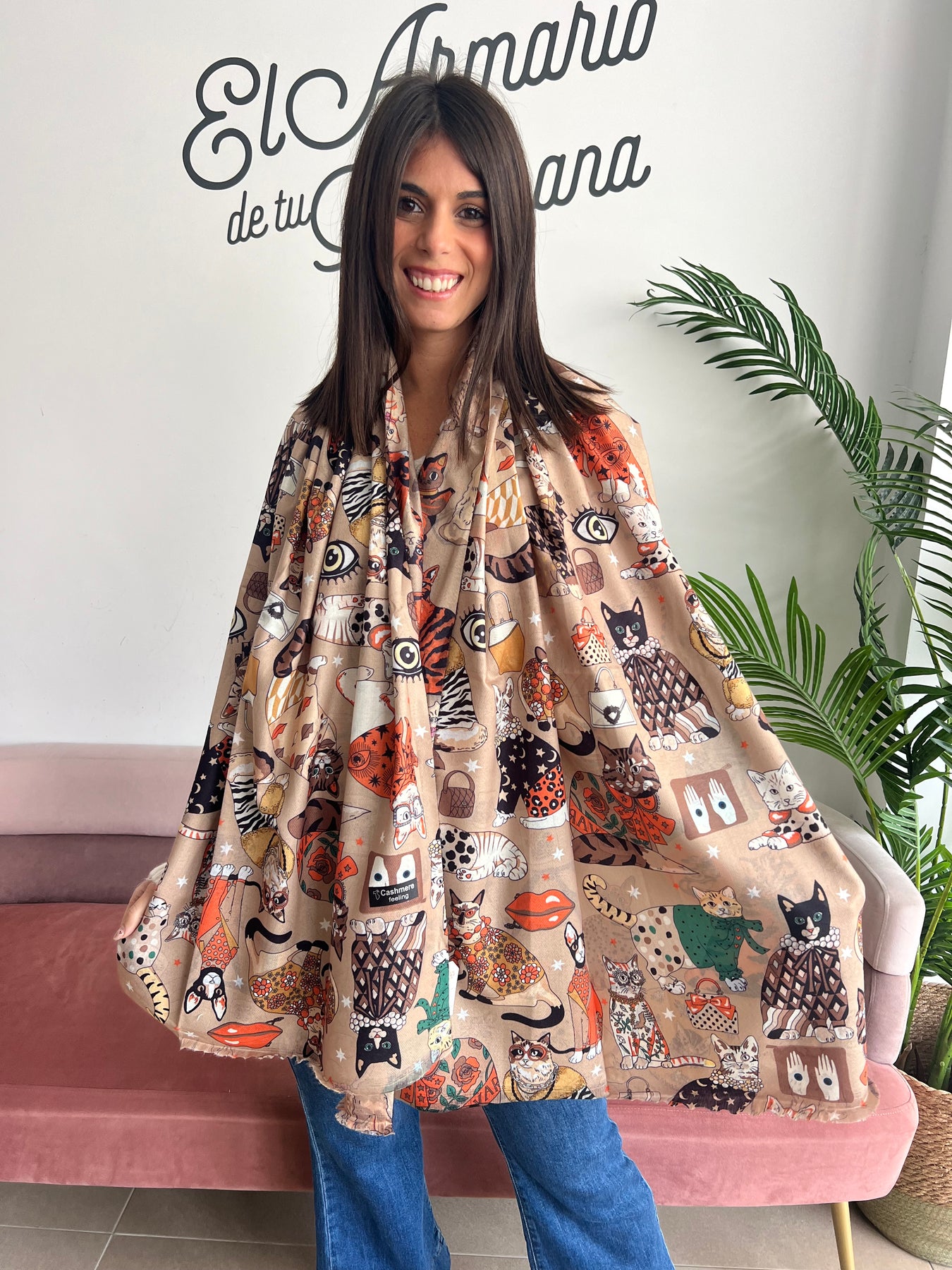 Un accesorio lleno de personalidad y originalidad. Este pañuelo en tonos tierra está repleto de ilustraciones de gatitos con estilo, ojos místicos y detalles únicos que lo hacen simplemente irresistible. Su tejido suave y envolvente lo convierte en la opción perfecta para quienes aman destacar sin perder comodidad.