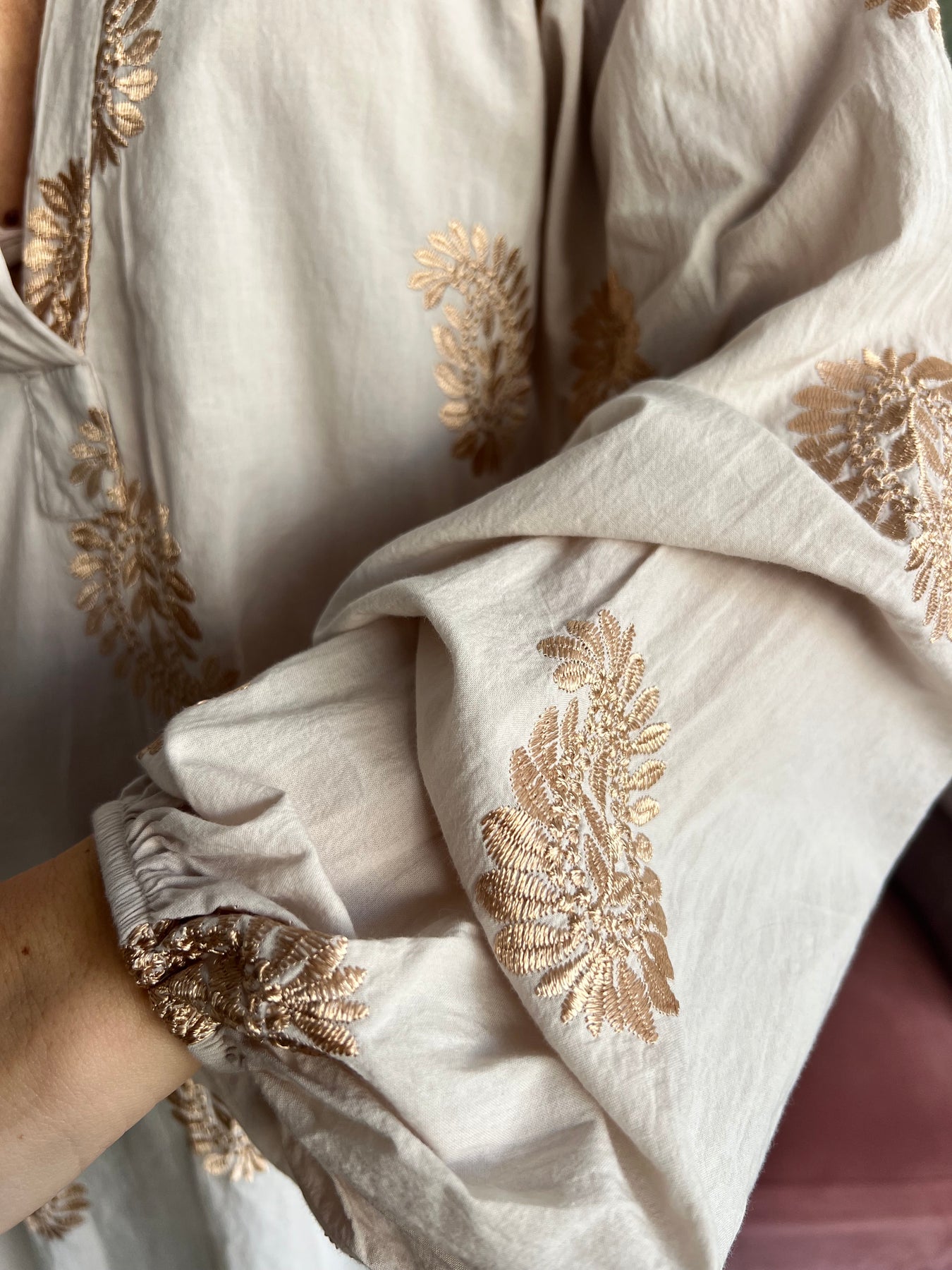 Tiene un tejido ligero y con caída, súper agradable al tacto, y unos bordados que le dan ese toque delicado y diferente que enamora. El escote en pico estiliza muchísimo y las mangas abullonadas con puño elástico aportan ese aire romántico que queda ideal tanto con vaqueros como con pantalones más arreglados.
