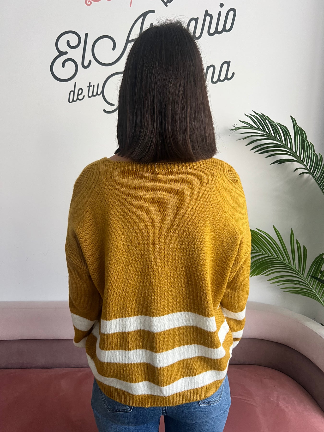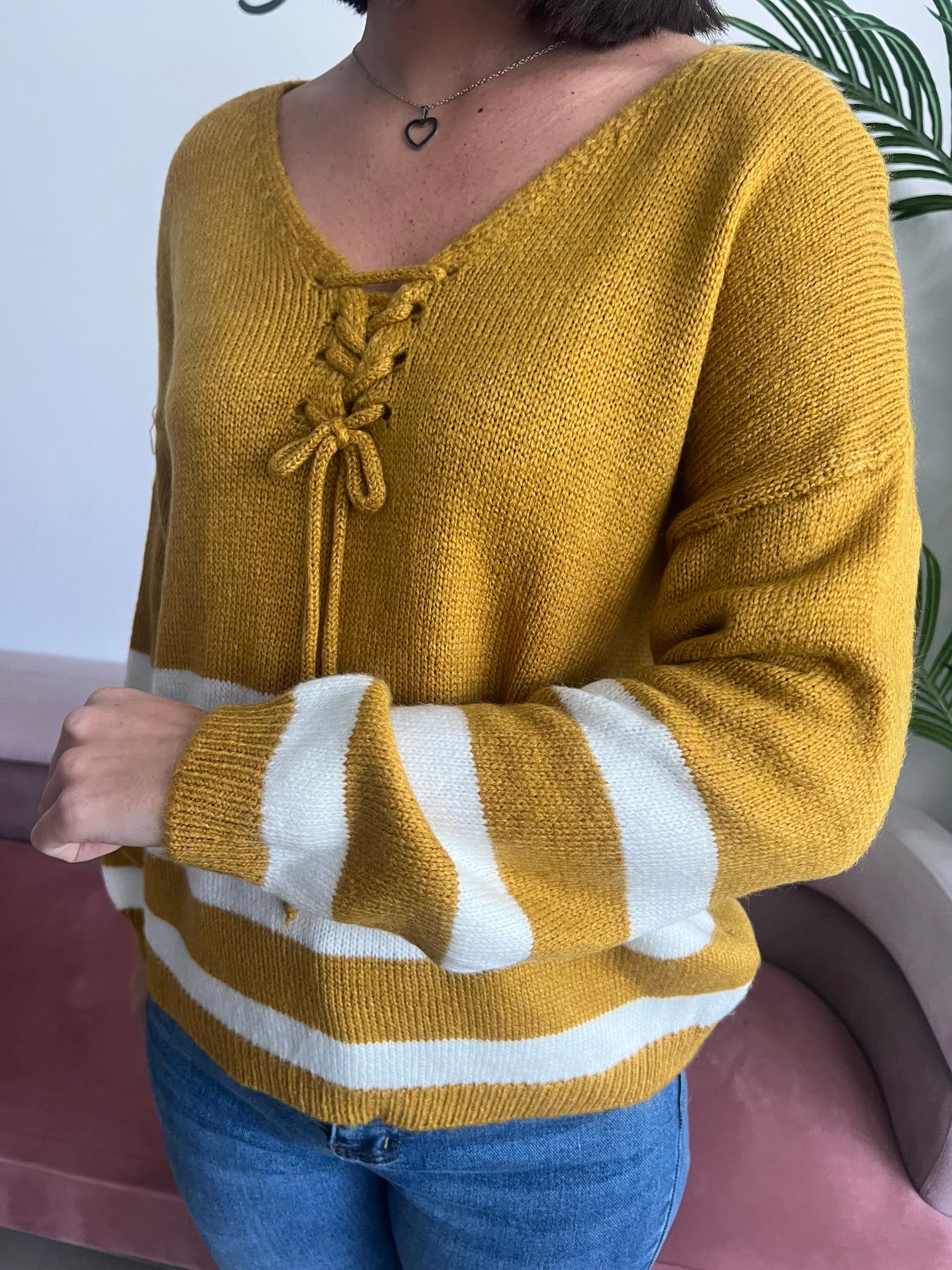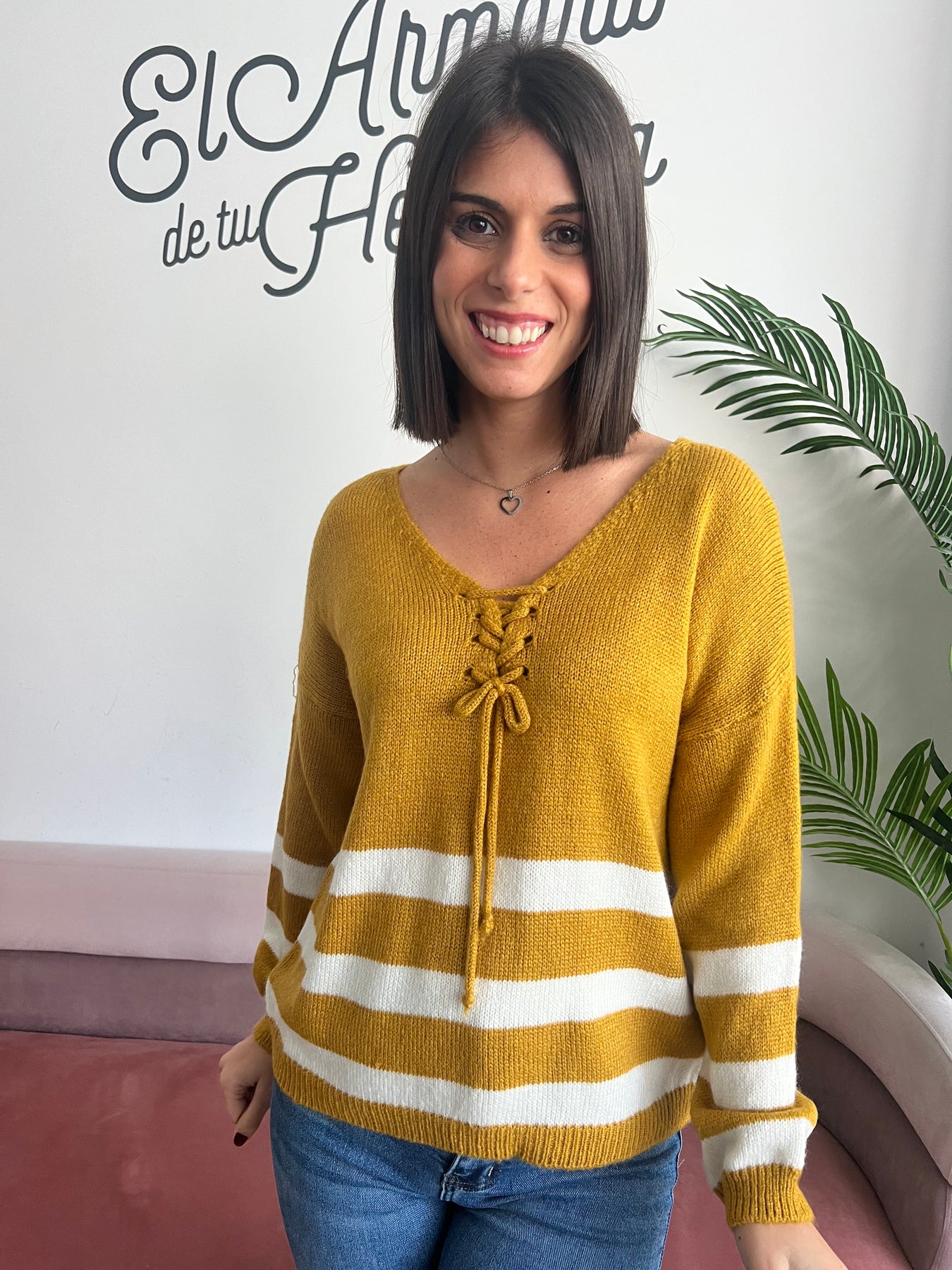 Diseño de rayas en tonos suaves, cuello en pico con detalle de lazada y tejido gustoso y cómodo, perfecto para el día a día.