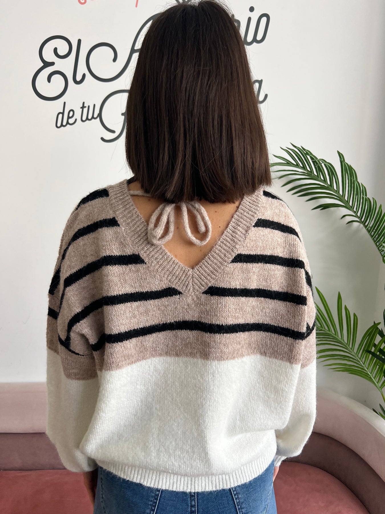 El escote en pico estiliza muchísimo y sienta genial, mientras que el detalle trasero con lazada le da ese puntito especial que marca la diferencia y eleva cualquier look 🎀. Es un jersey ligero pero abrigadito, perfecto para entretiempo o para combinar en capas cuando refresca 🍂