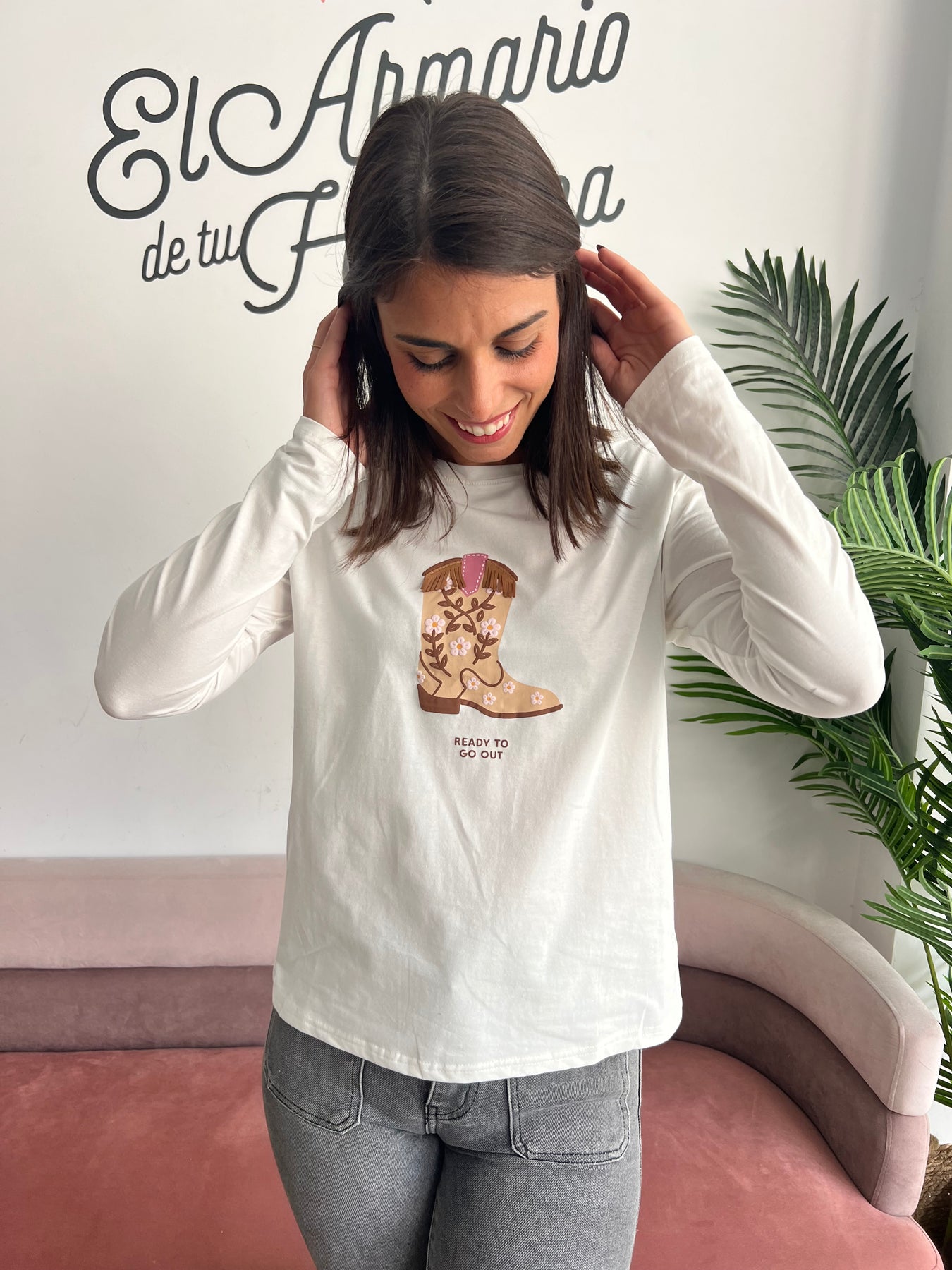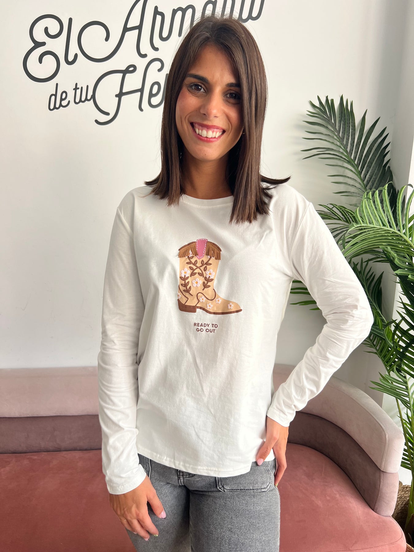 🌼 ¡Lista para salir con estilo! 🤠 Esta camiseta blanca de manga larga es puro amor. Lleva un precioso estampado de una bota cowboy decorada con flores bordadas y flecos en relieve, acompañada de la frase “Ready to go out” que dice todo por ti 💬✨. Es ideal para aportar un toque divertido y original a cualquier look del día a día, con ese aire western chic que tanto nos gusta. 🐎🤍