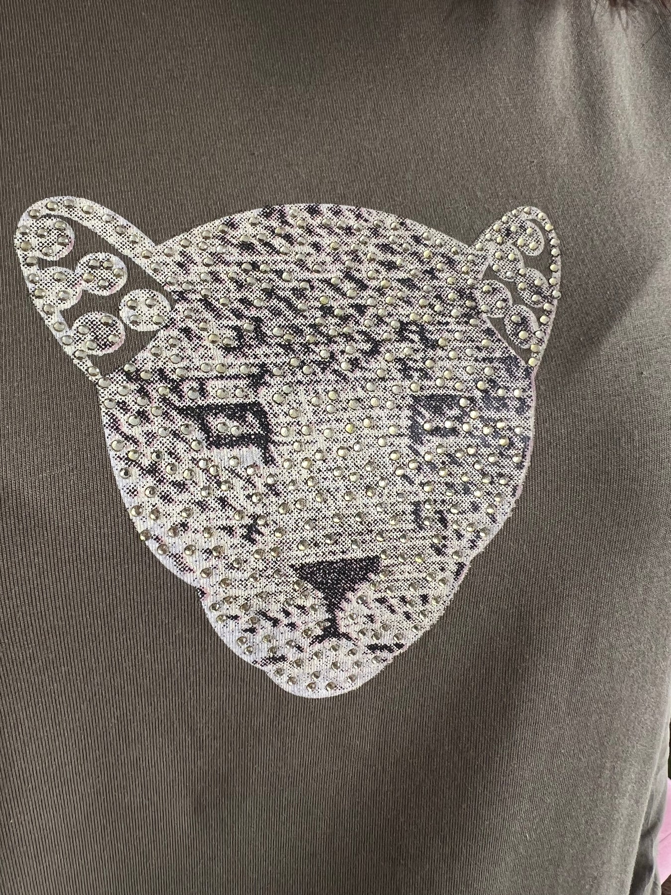 Si te gustan los looks cómodos pero con personalidad, esta camiseta es para ti. Es súper versátil y fácil de combinar, pero lo que realmente destaca es su diseño central de leopardo en glitter dorado, que aporta un toque salvaje y brillante sin ser excesivo. ¡Ideal para dar ese punto especial a tus looks diarios! 👌🏼