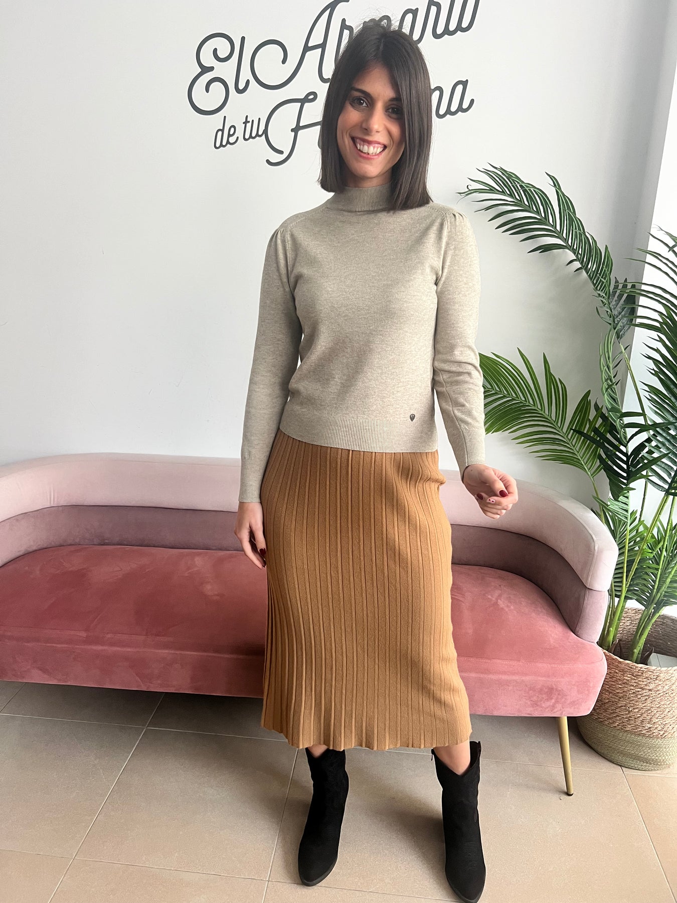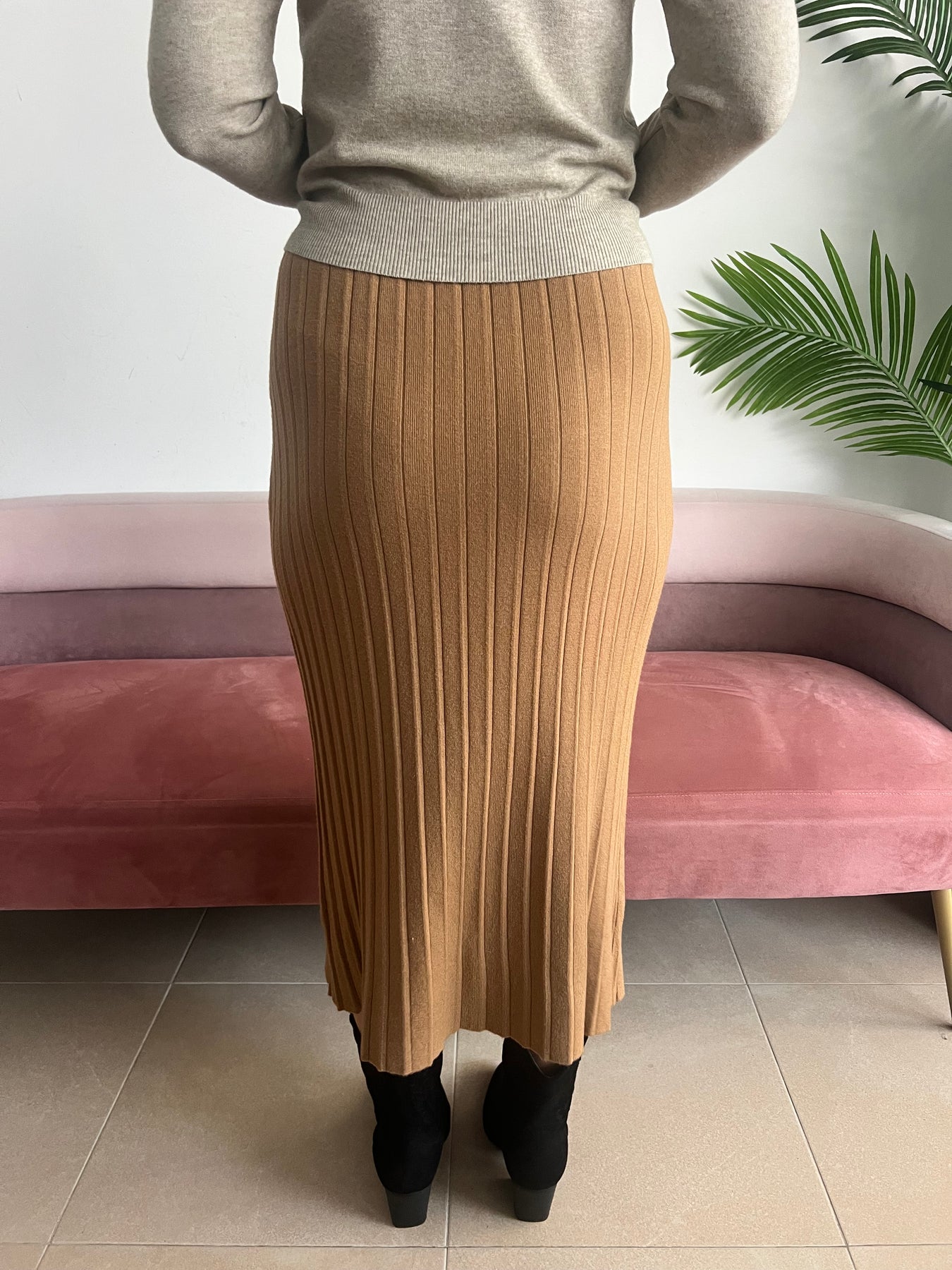 Falda de punto con diseño plisado, cómoda, suave y con una caída preciosa que sienta increíble. Se adapta genial al cuerpo sin marcar y es perfecta para llevar tanto con jerseys ajustados como con prendas más sueltas.