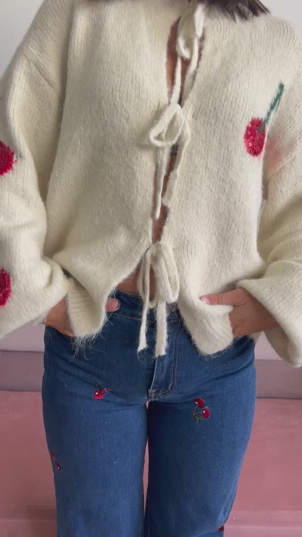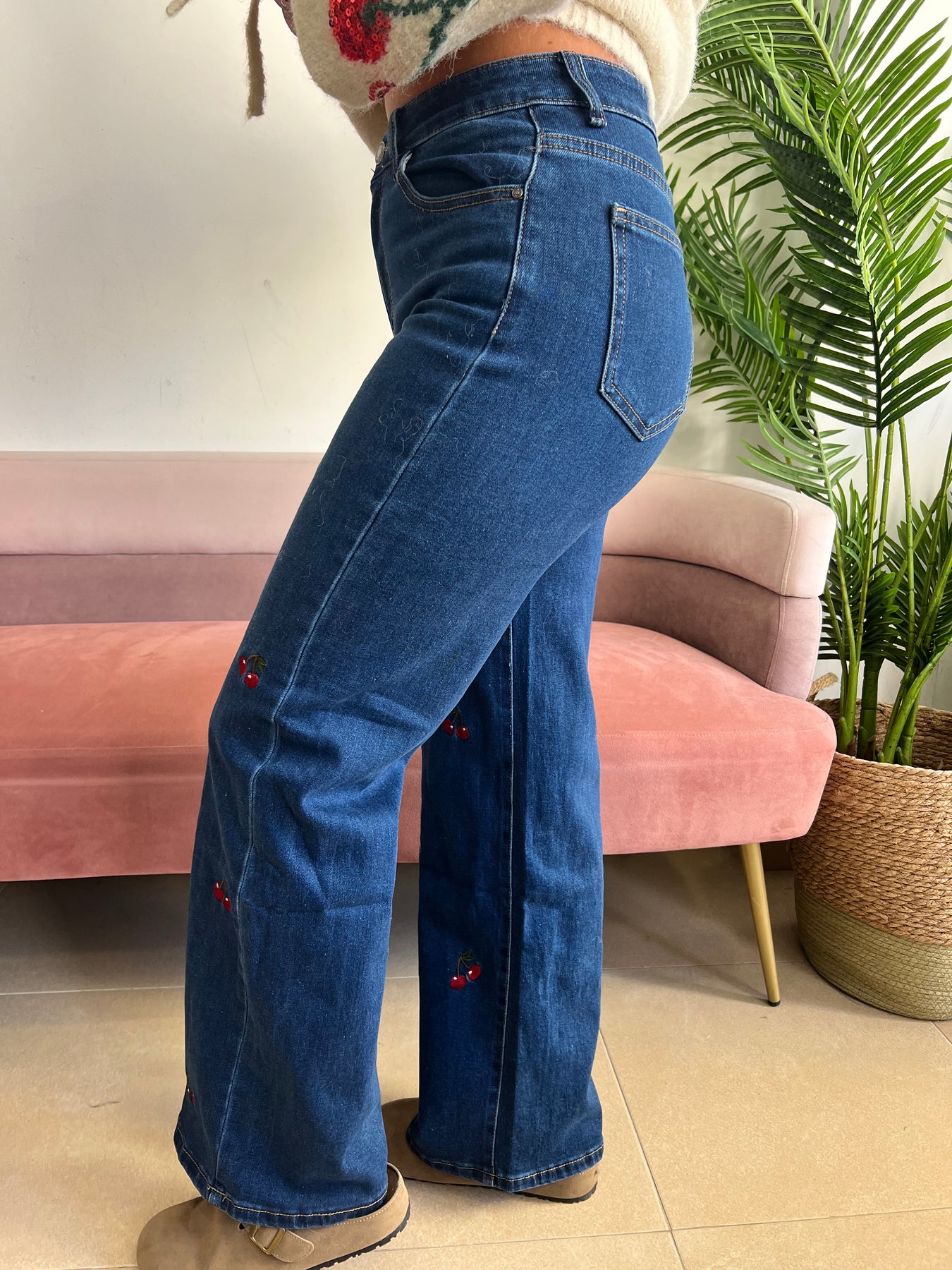 ¡Los vaqueros más dulces de la temporada están aquí! Este modelo de tiro alto y corte recto es una oda al detalle: está lleno de pequeños bordados de cerezas que lo convierten en una prenda especial, divertida y con mucha personalidad. Su tejido denim es cómodo, con la estructura justa para estilizar sin apretar.
