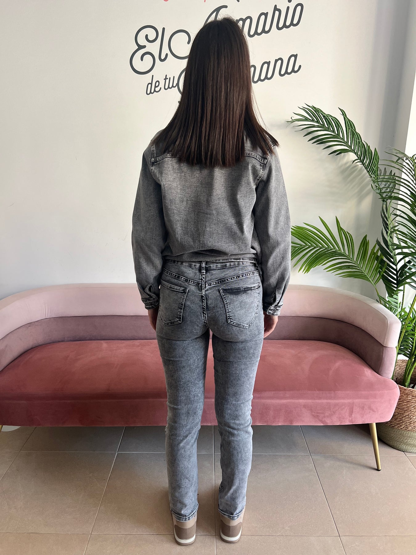 Este vaquero gris lavado es un básico con rollazo. Corte recto ajustado, con bolsillos delanteros y traseros, cierre con botón y cremallera, y detalles de efecto desgastado que le dan un toque muy cañero.