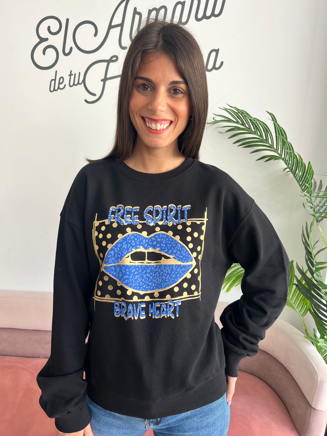 Su estampado en dorado con labios azules, lunares y el mensaje FREE SPIRIT / BRAVE HEART es toda una declaración de intenciones.