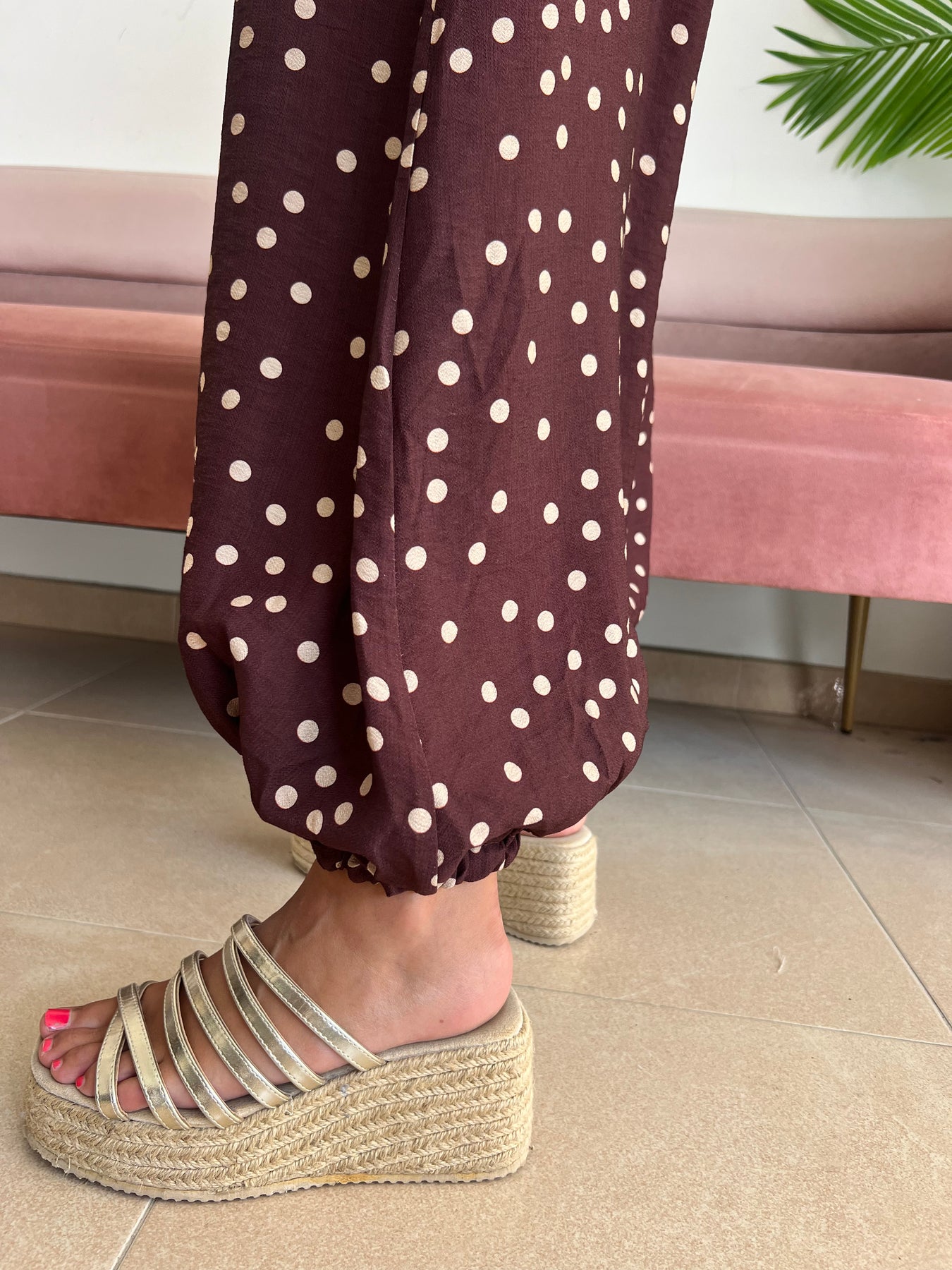 Comodidad y estilo en una sola prenda ✨. Este pantalón fluido con estampado de lunares es ligero, fresco y con muchísimo rollazo 🔥. Su cinturilla elástica se adapta perfectamente y su diseño suelto con goma en los bajos aporta movimiento y un toque diferente a cualquier look.