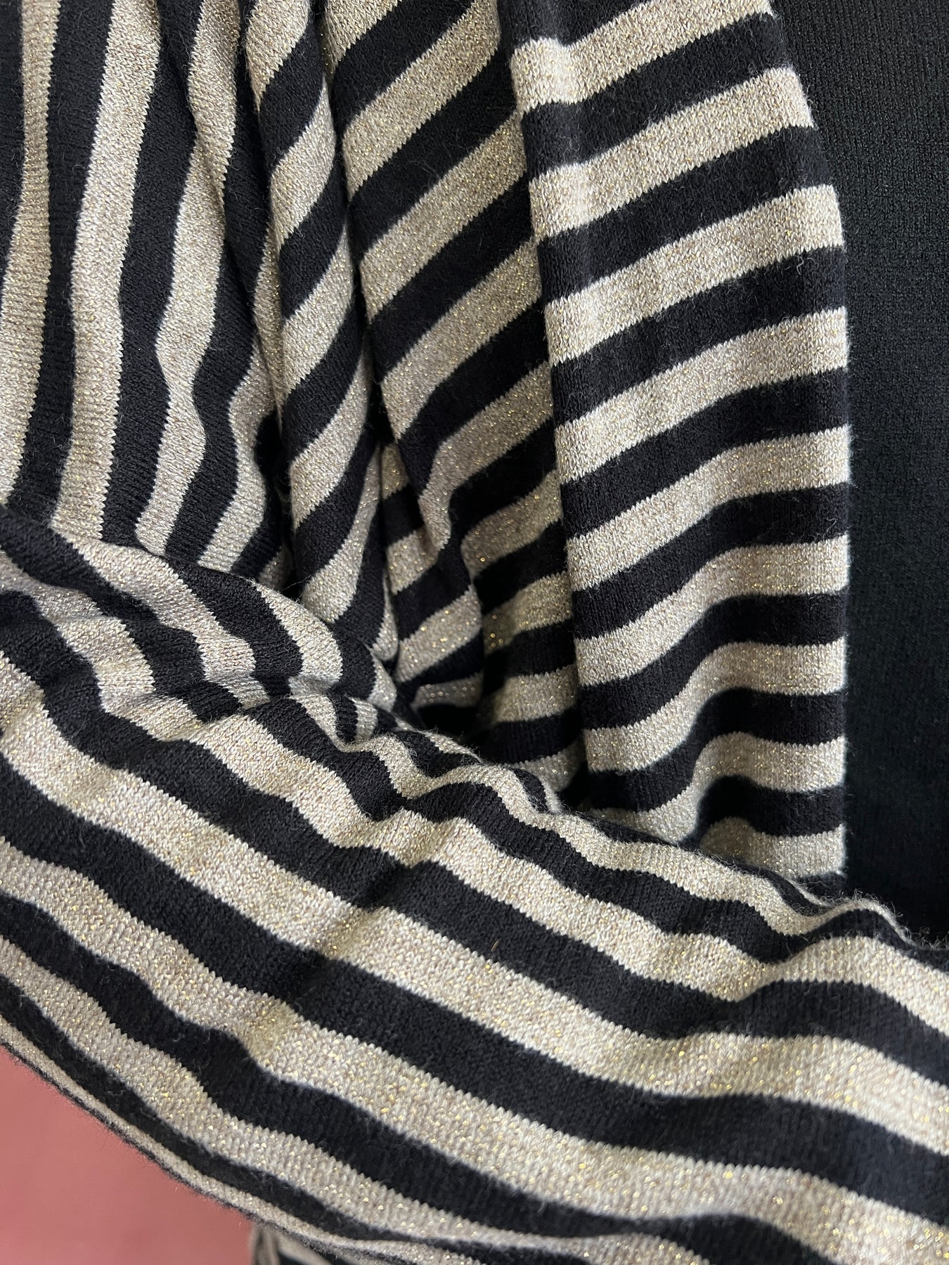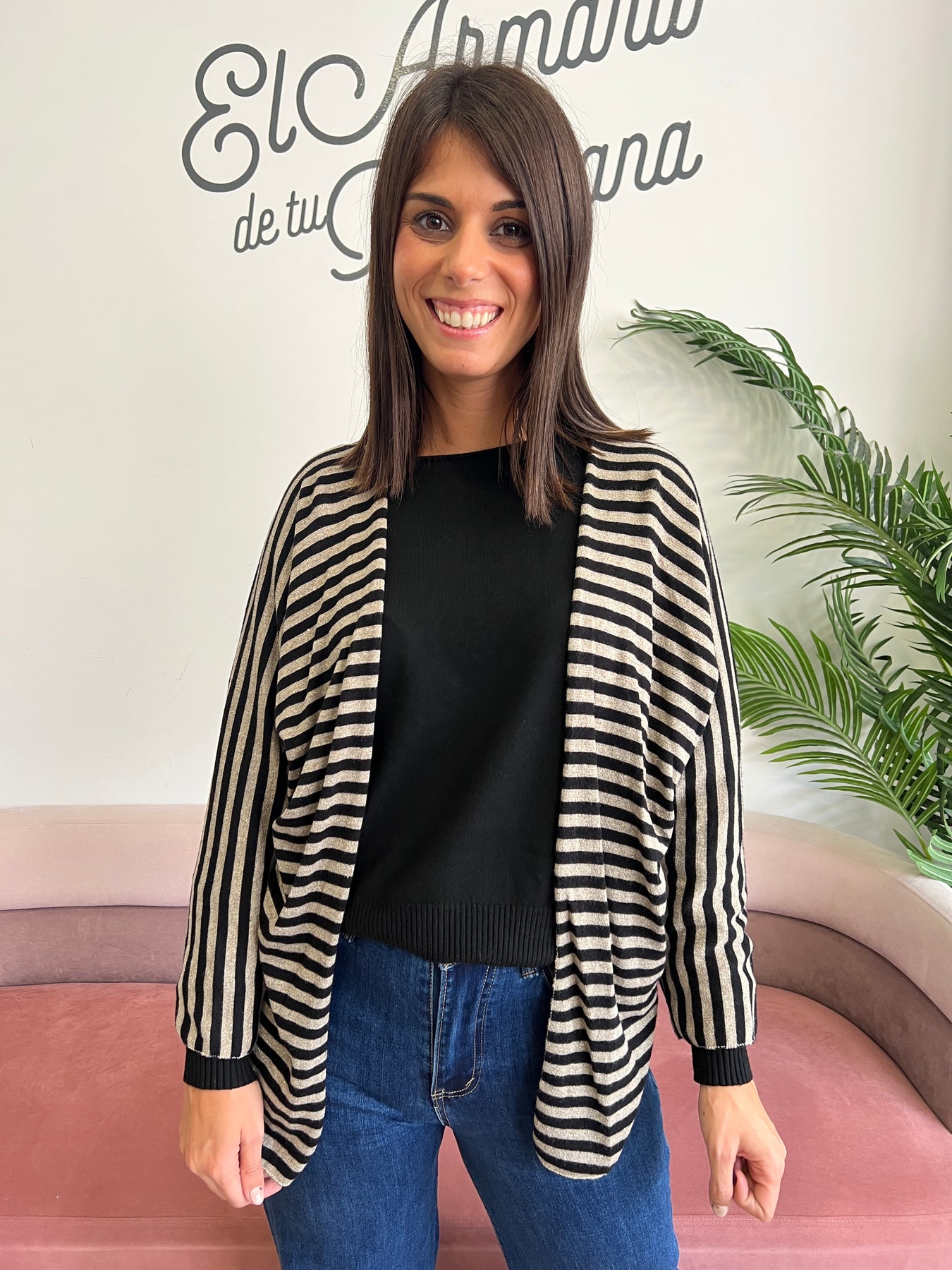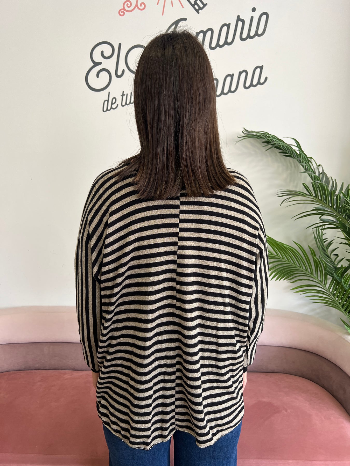 De rayas finas con hilos metalizados en dorado que le dan ese toque de brillo elegante (¡pero sin pasarse!), y una caída fluida que favorece muchísimo.