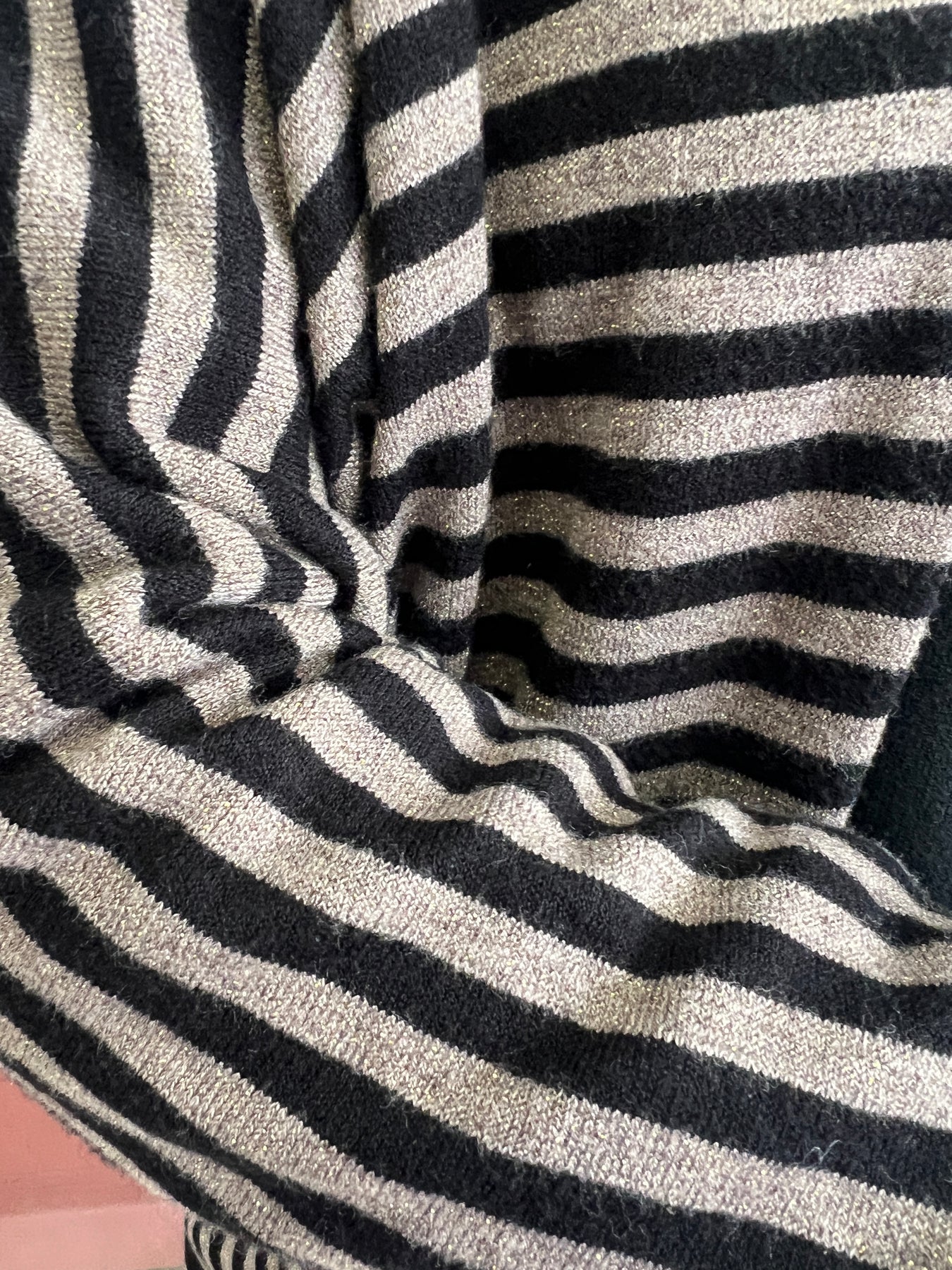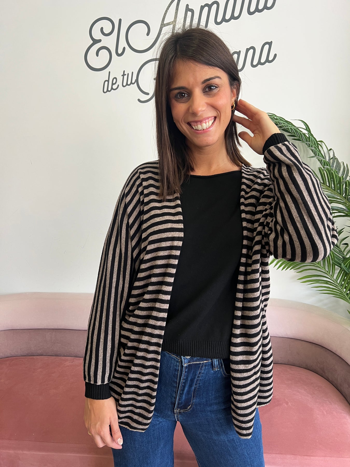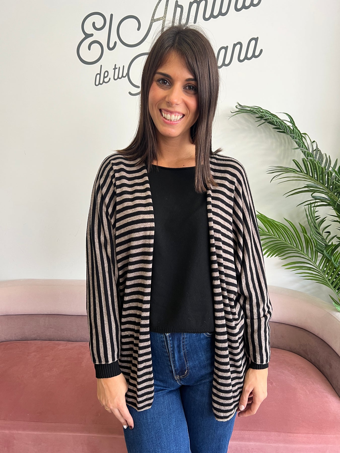 De rayas finas con hilos metalizados en dorado que le dan ese toque de brillo elegante (¡pero sin pasarse!), y una caída fluida que favorece muchísimo.