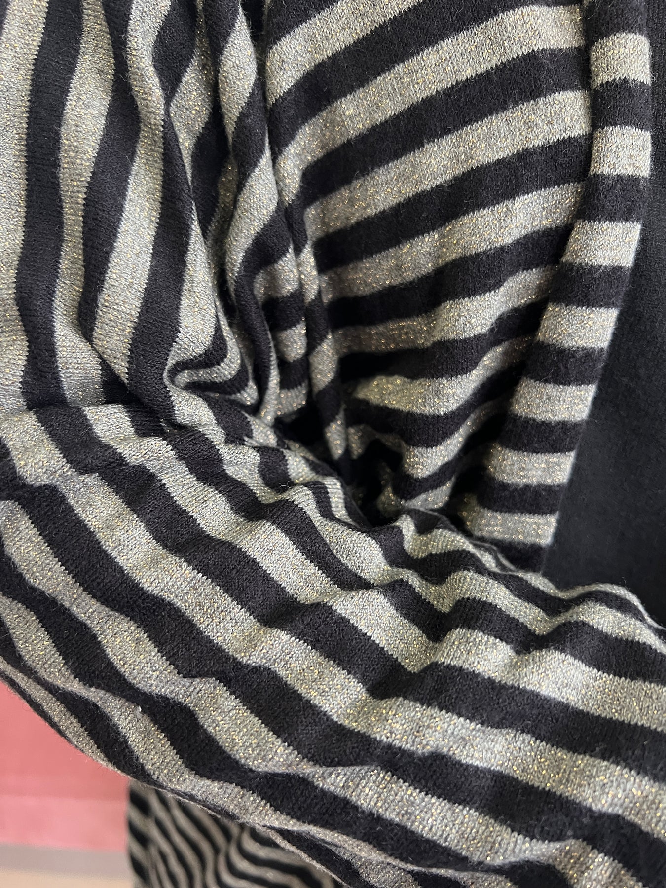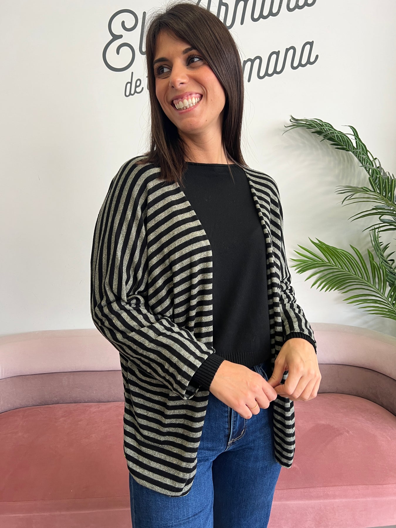 De rayas finas con hilos metalizados en dorado que le dan ese toque de brillo elegante (¡pero sin pasarse!), y una caída fluida que favorece muchísimo.