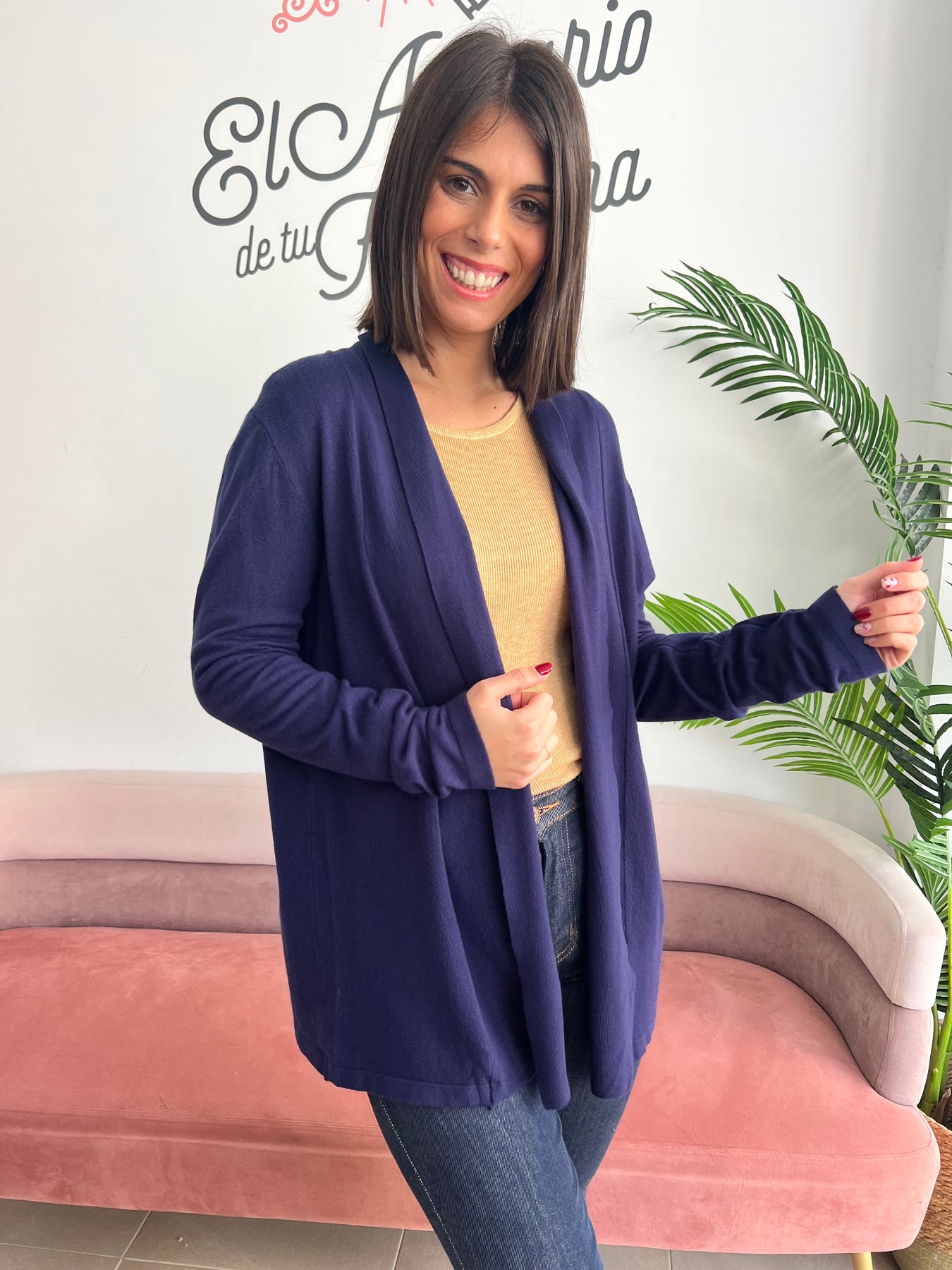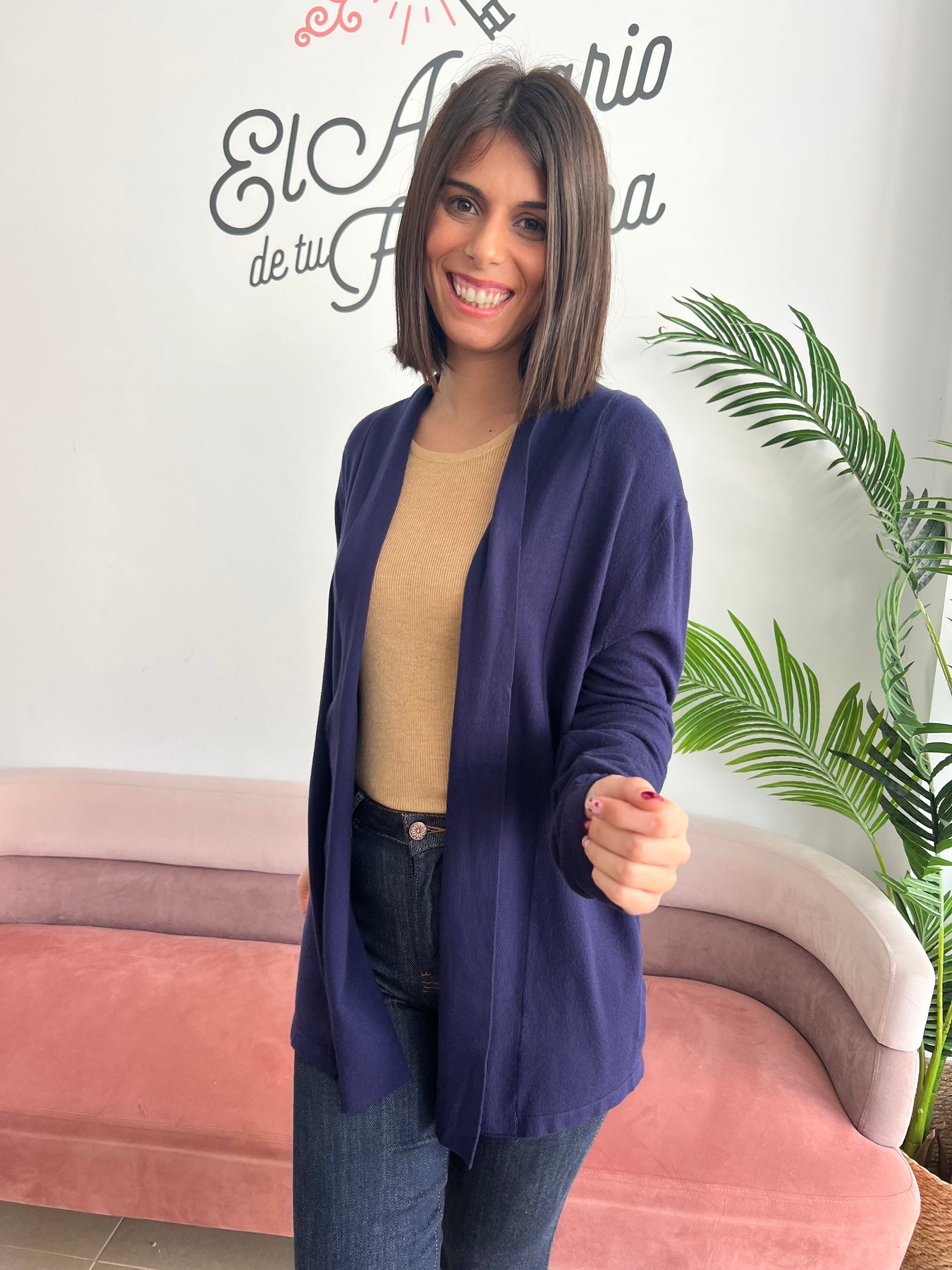 Chaqueta abierta de punto fino, ligera y muy cómoda, ideal para completar cualquier look del día a día. Su diseño fluido y sin cierre la convierte en una prenda súper versátil, perfecta para llevar sobre camisetas, jerséis o vestidos.