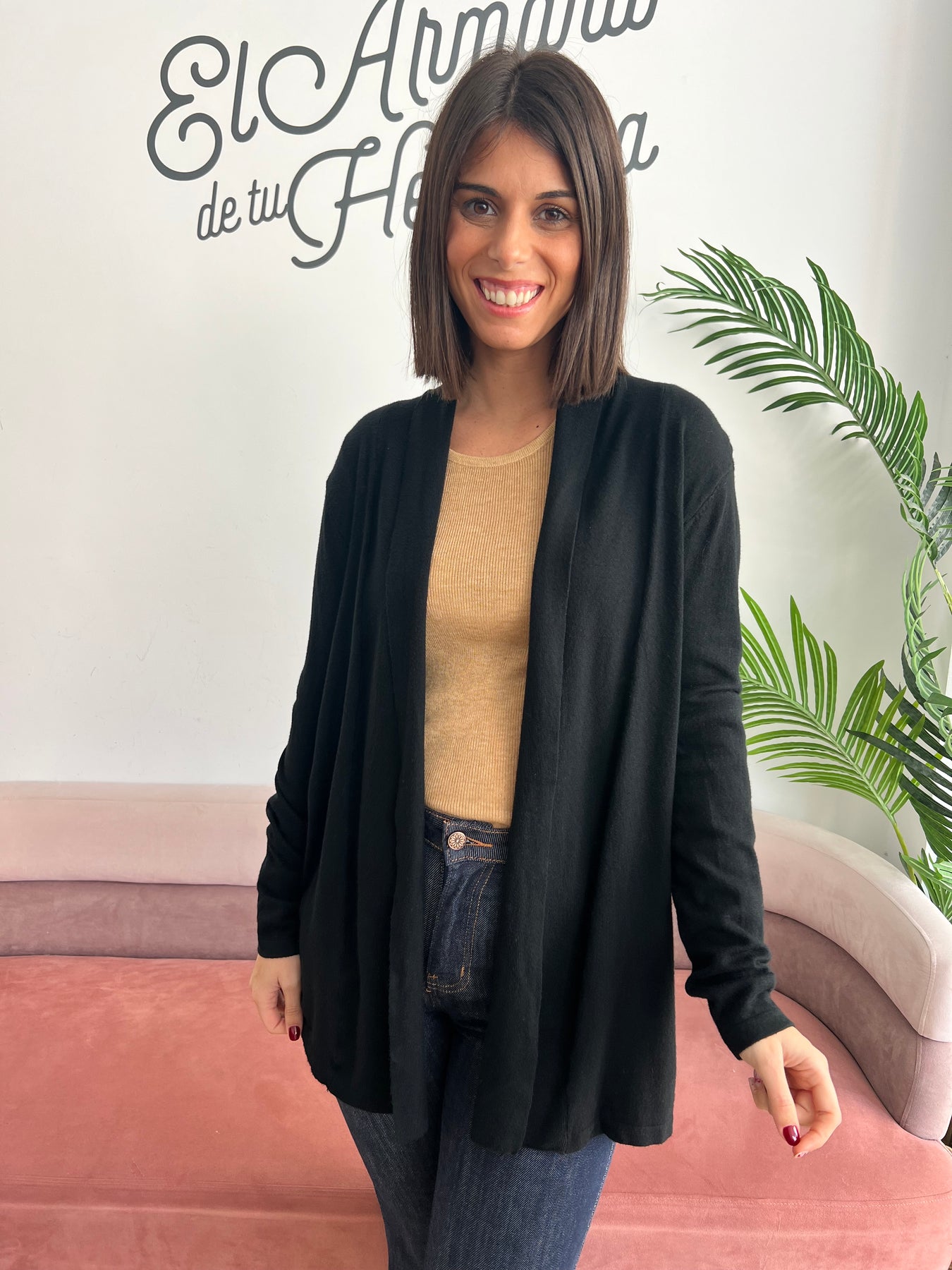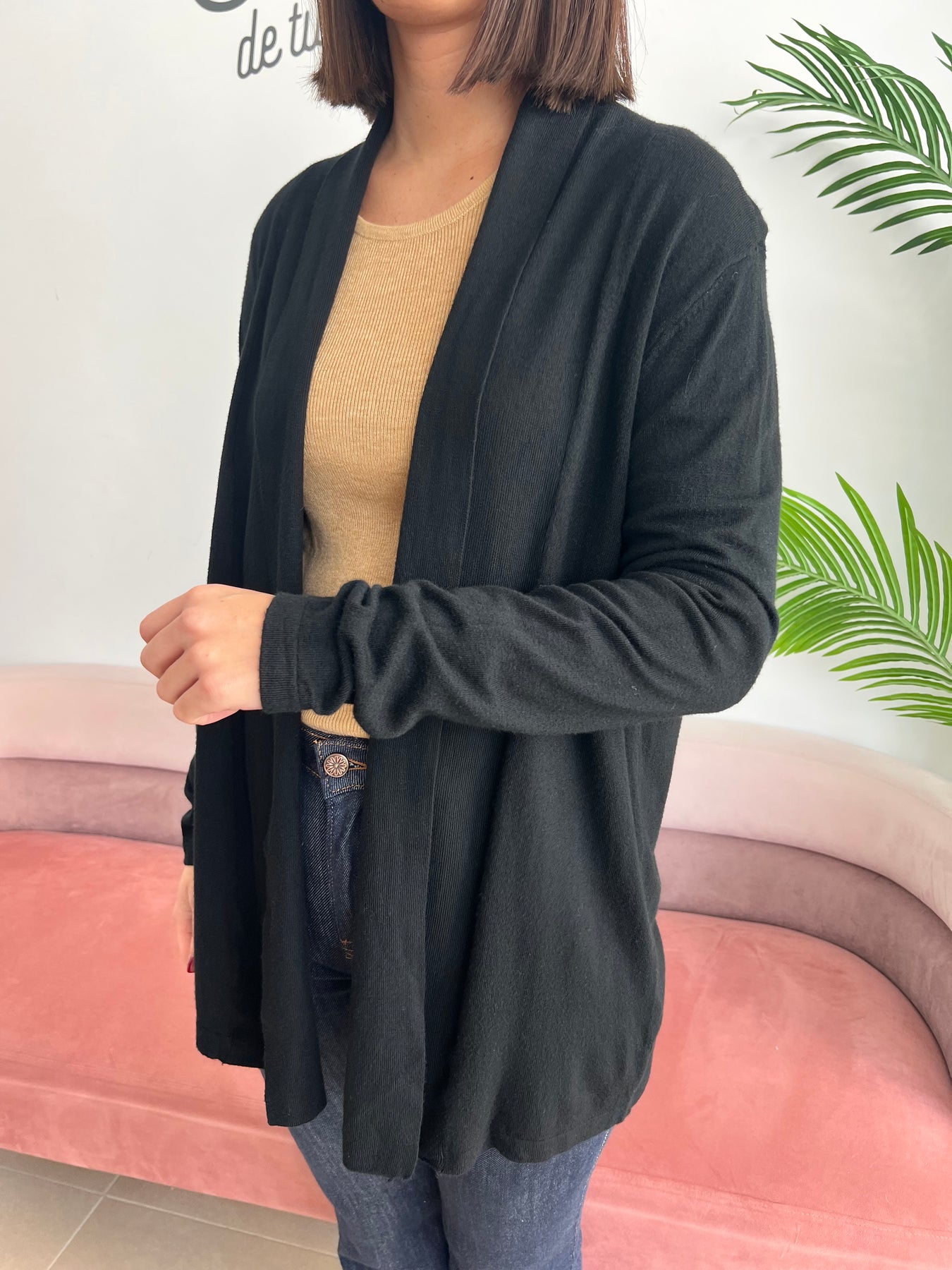 Chaqueta abierta de punto fino, ligera y muy cómoda, ideal para completar cualquier look del día a día. Su diseño fluido y sin cierre la convierte en una prenda súper versátil, perfecta para llevar sobre camisetas, jerséis o vestidos.