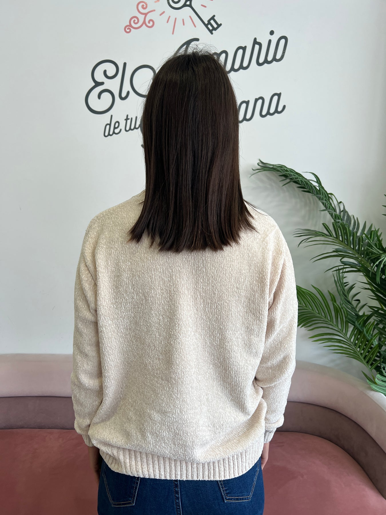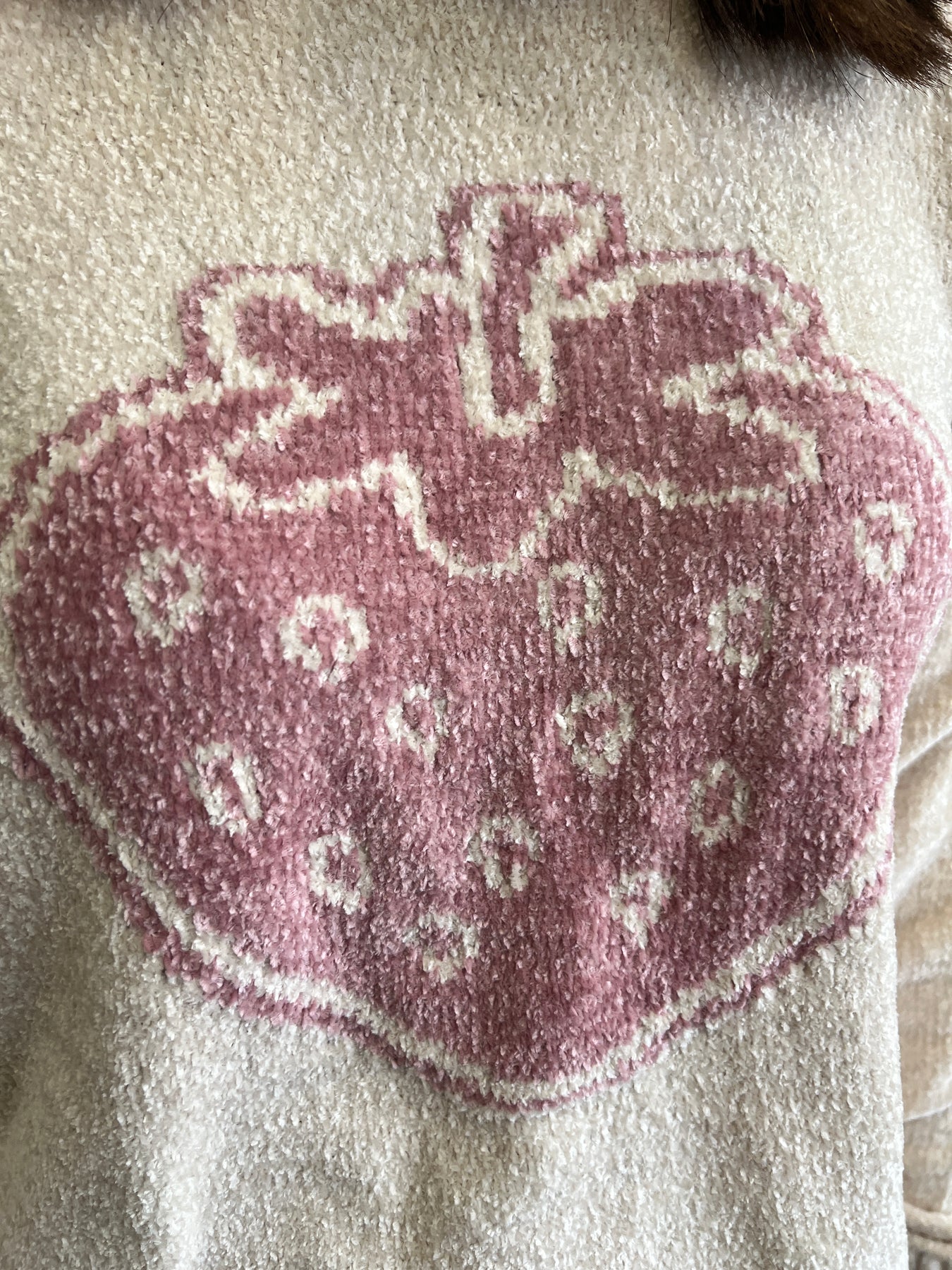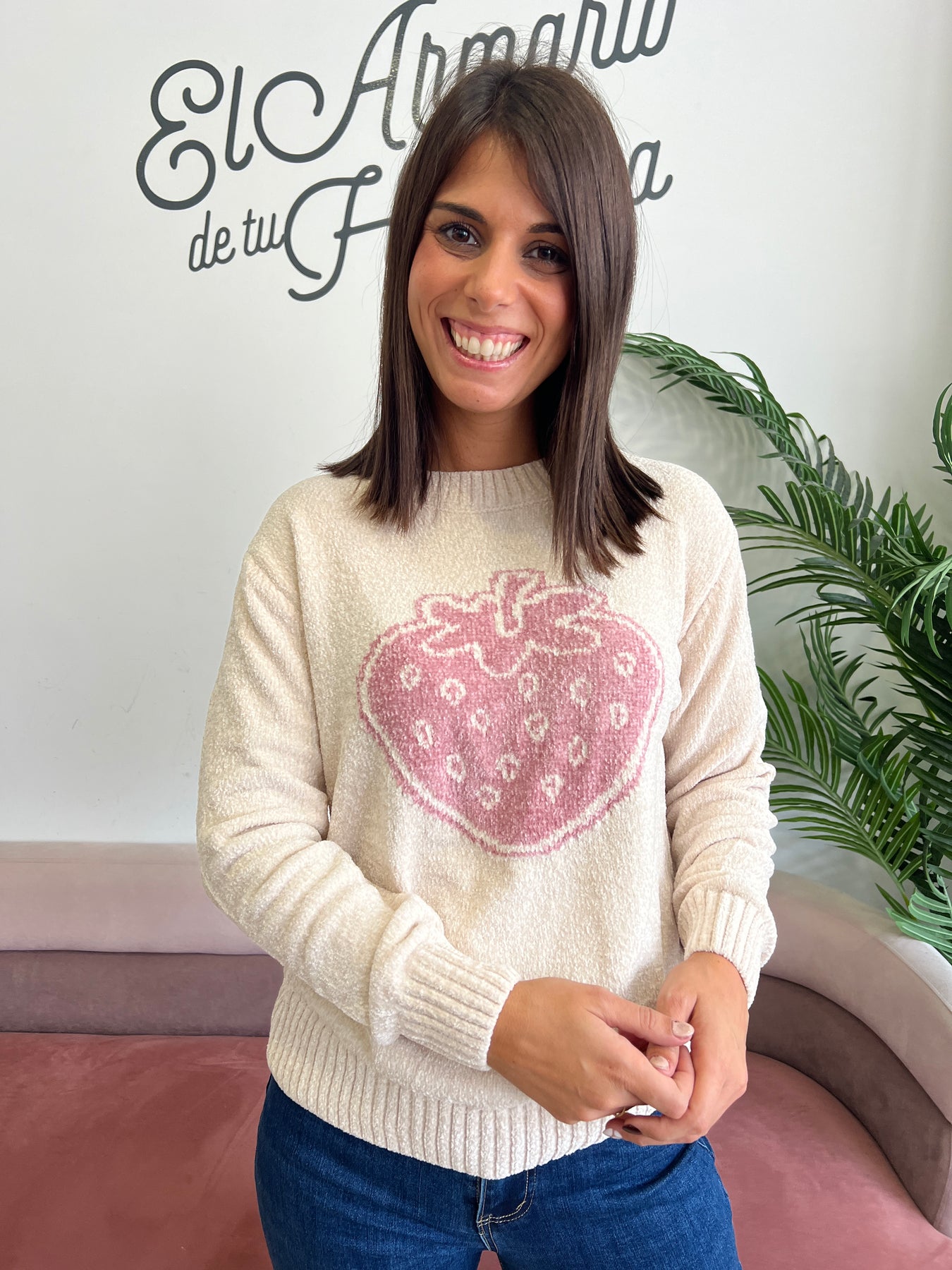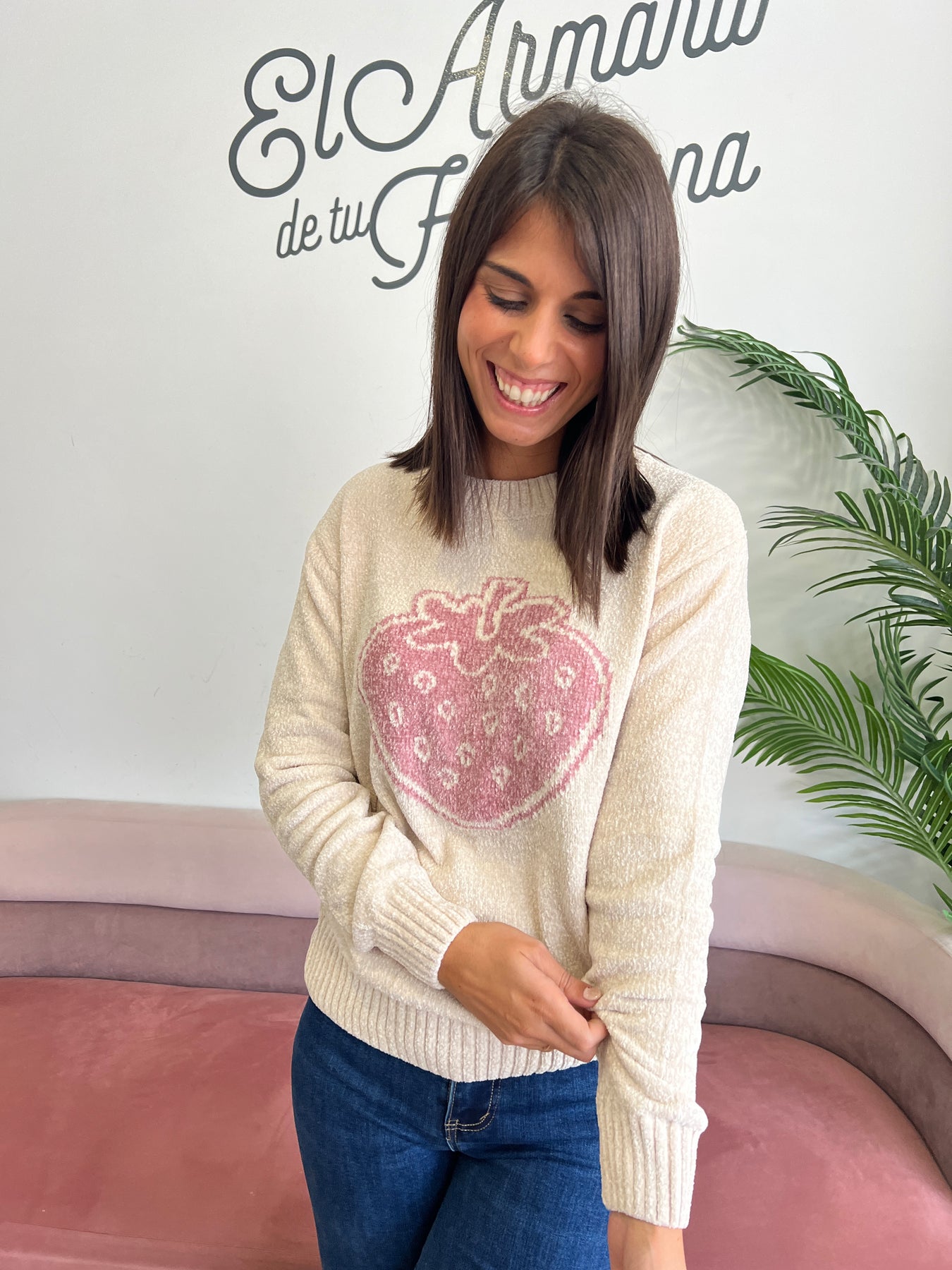 Dulce, divertido y muy suave. Este jersey de chenilla en tono crudo con una gran fresa rosa bordada en el centro es perfecto para darle un toque original y alegre a tus looks de otoño-invierno. Su tejido de chenilla es ultra suave, con textura esponjosa y muy confortable. Tiene cuello redondo, puños y bajo de canalé, y corte ligeramente holgado que sienta genial.
