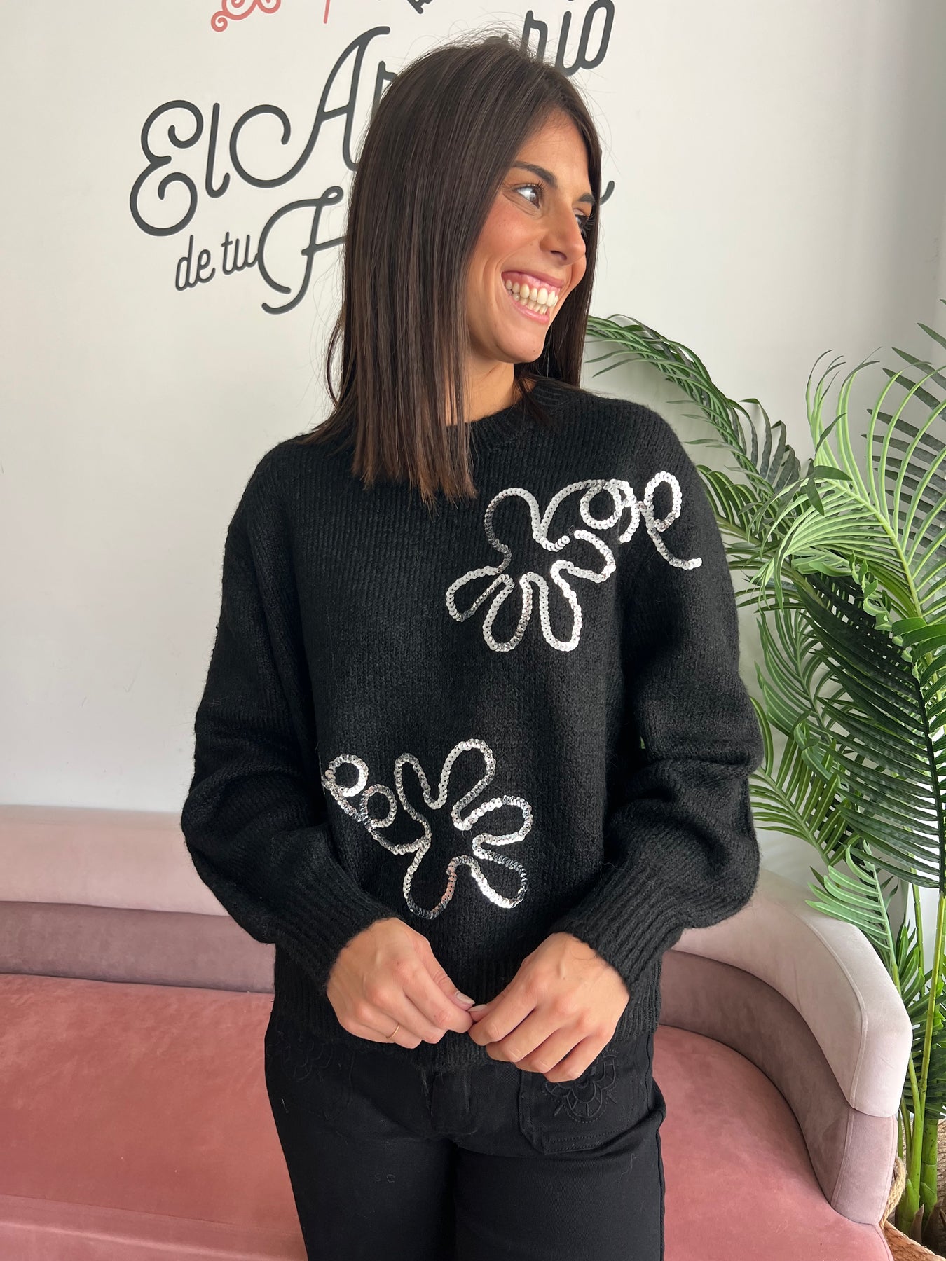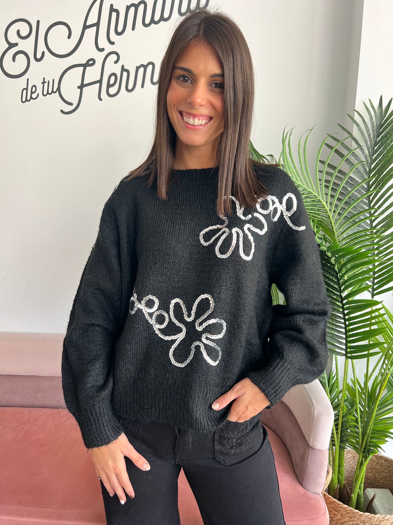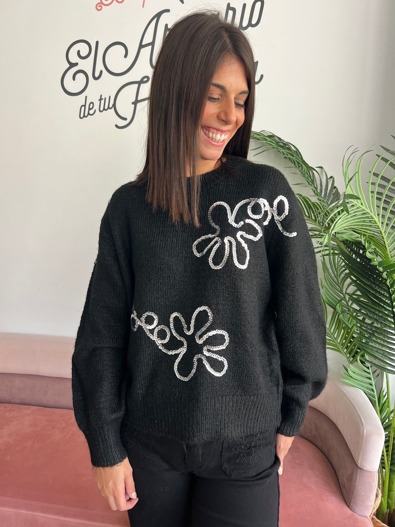 ✨Este jersey es pura fantasía: cálido, suave y con un toque diferente que lo hace especial. Su diseño en color crudo se adorna con flores abstractas bordadas en lentejuelas negras, creando un contraste precioso y muy original.