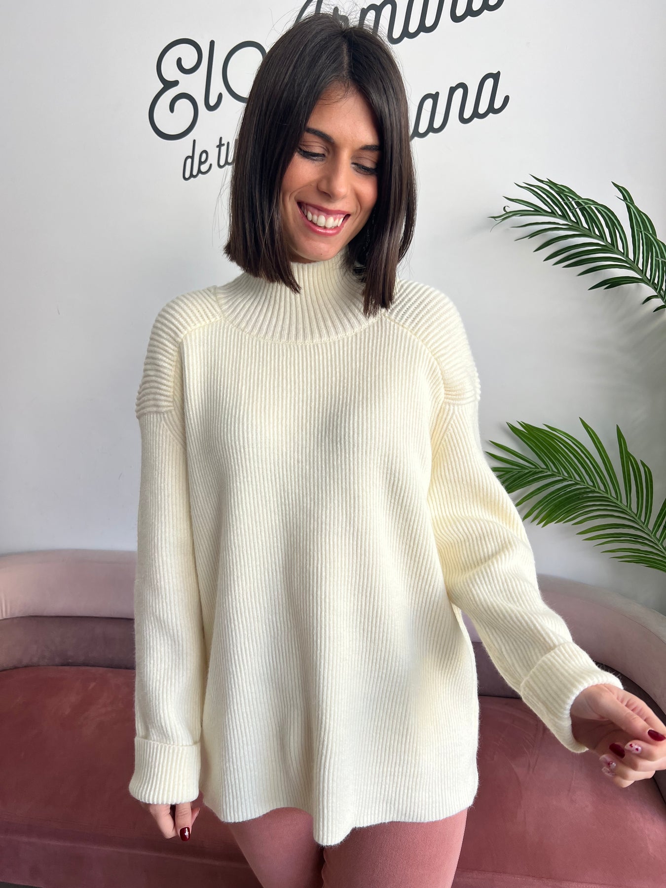 El cuello subido aporta un toque elegante y abriga sin agobiar, perfecto para los días más frescos 🍂. Su punto es suave y gustoso, ideal para llevar durante horas con total comodidad 🌿. Las mangas ligeramente amplias le dan movimiento y un aire actual que favorece muchísimo 💫