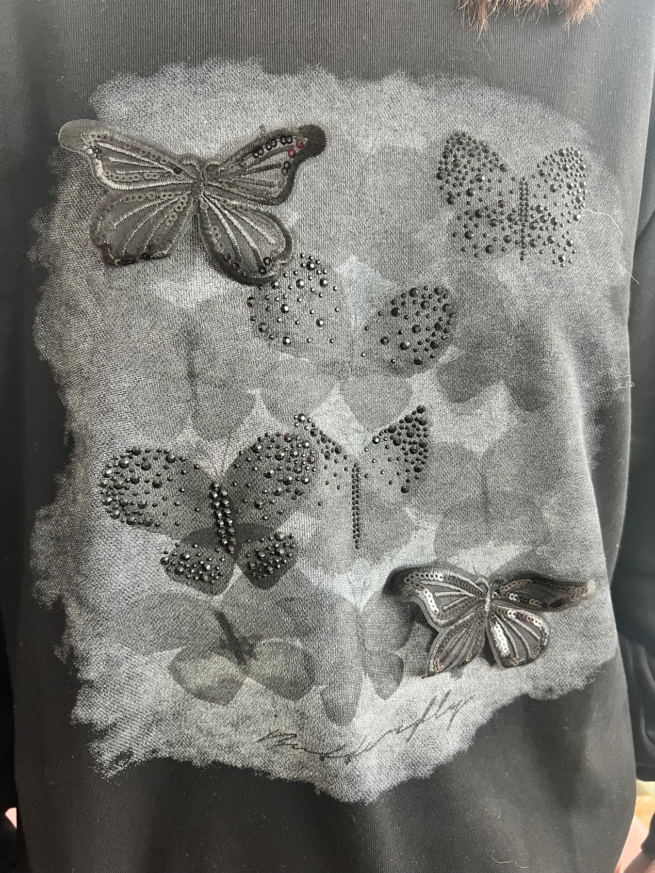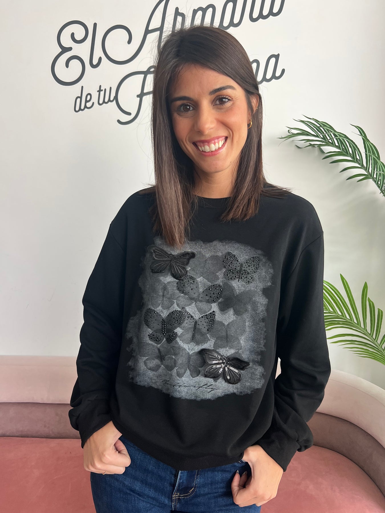 Una prenda que enamora por su diseño delicado y original. Esta sudadera combina la suavidad del tejido con un estampado de mariposas en tonos neutros y detalles en relieve con pedrería y lentejuelas, aportando un toque brillante y especial a tu look 🖤✨