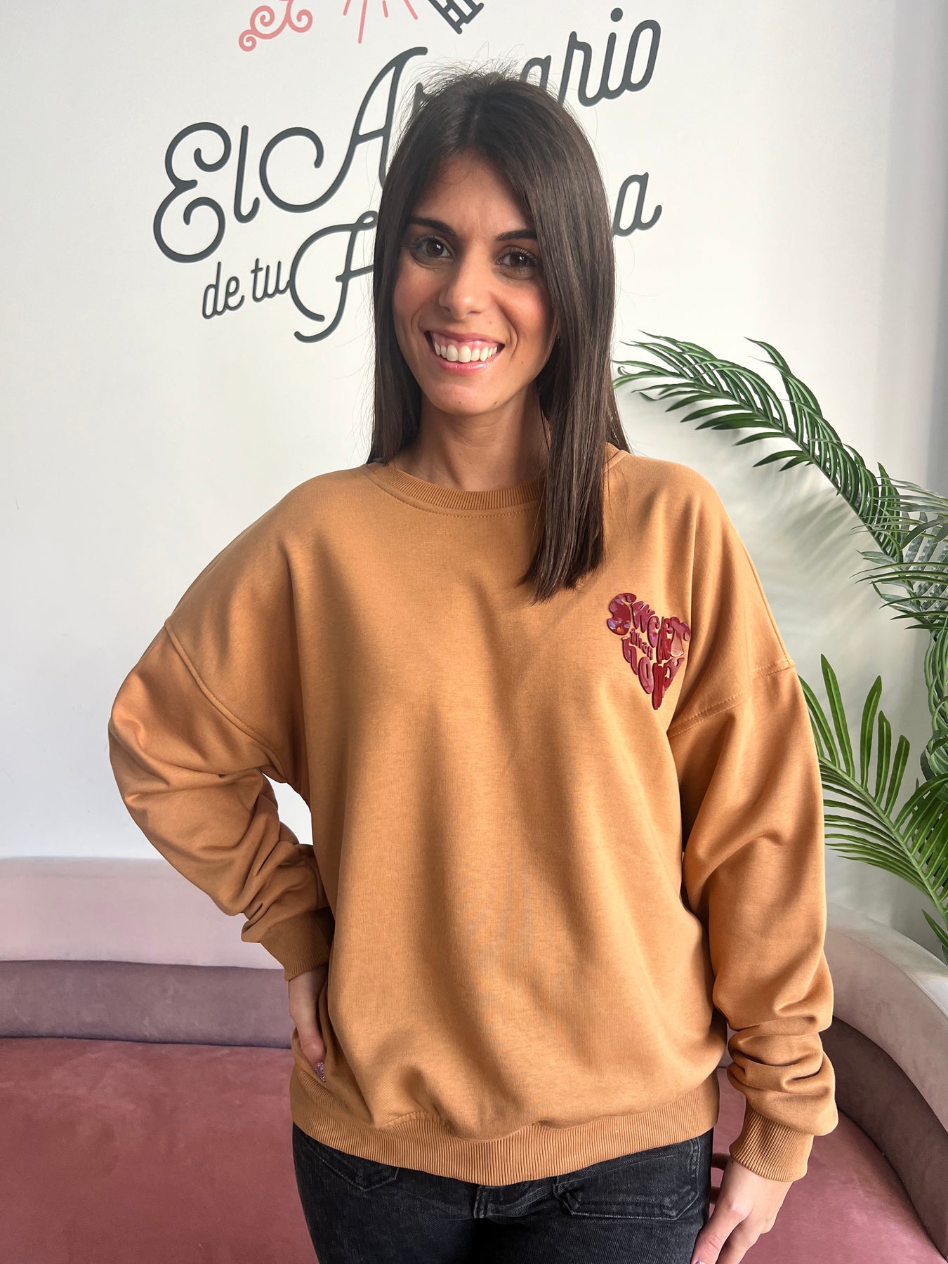 ¡Dulce, cómoda y con rollazo! Esta sudadera es una opción ideal para tus looks más urbanos y desenfadados. Tiene un diseño sencillo por delante, pero lo que la hace especial es su estampado en el pecho: unas letras en relieve con efecto goma que forman la frase “Sweeter than honey”, con un toque retro que enamora 😍🧡