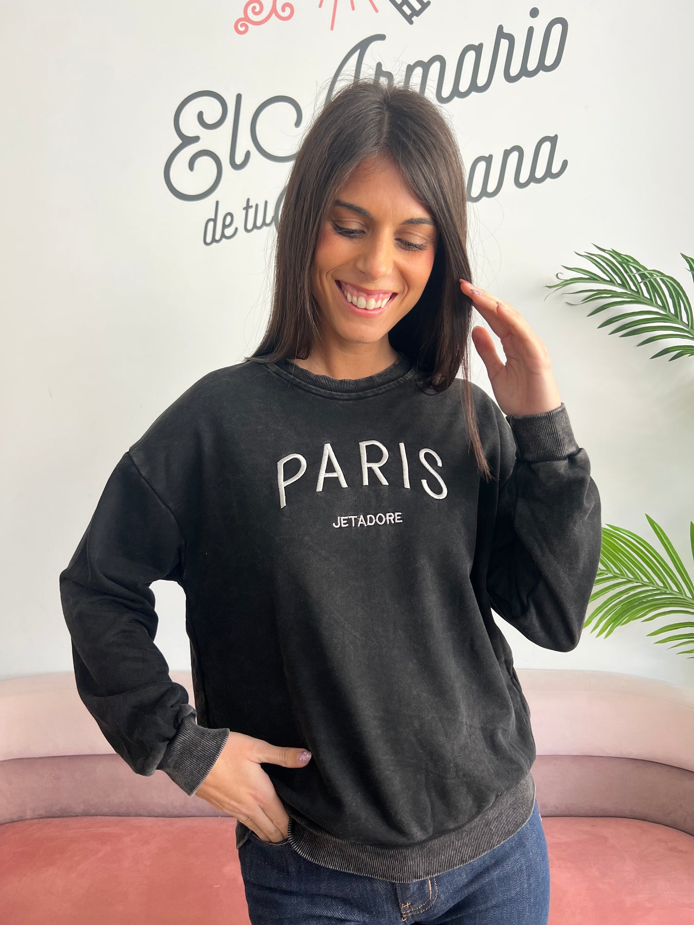 Tiene un fit cómodo, cuello redondo, y un estampado frontal con el texto “PARIS – JETADORE” que nos transporta directo a las calles más elegantes de la capital francesa 🥐🗼