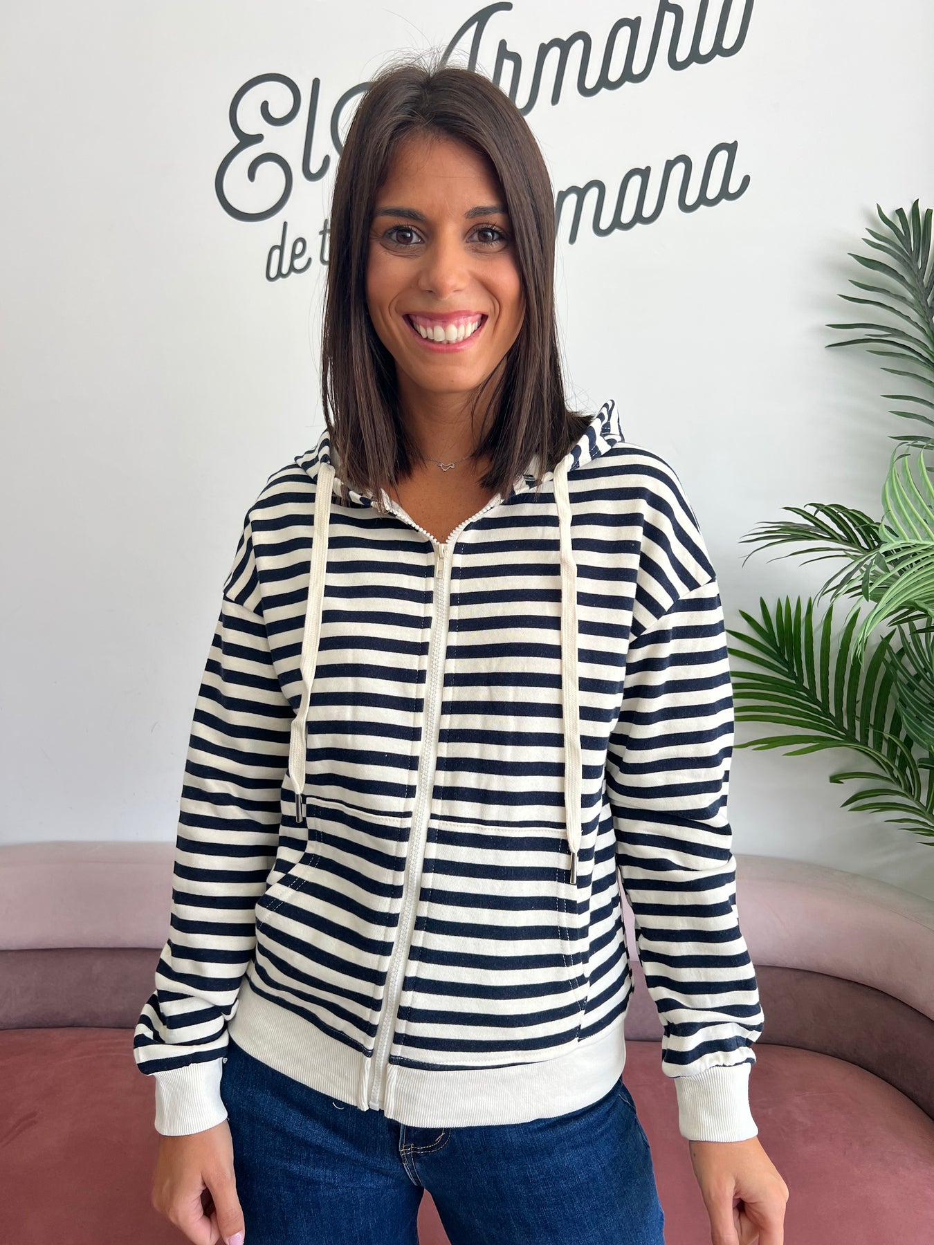 Con su diseño de rayas azul marino y blanco, esta sudadera aporta ese aire fresco y atemporal que nunca pasa de moda. Ideal para combinar tanto con vaqueros como con pantalones más arreglados, convirtiéndose en tu aliada perfecta para looks casual chic.