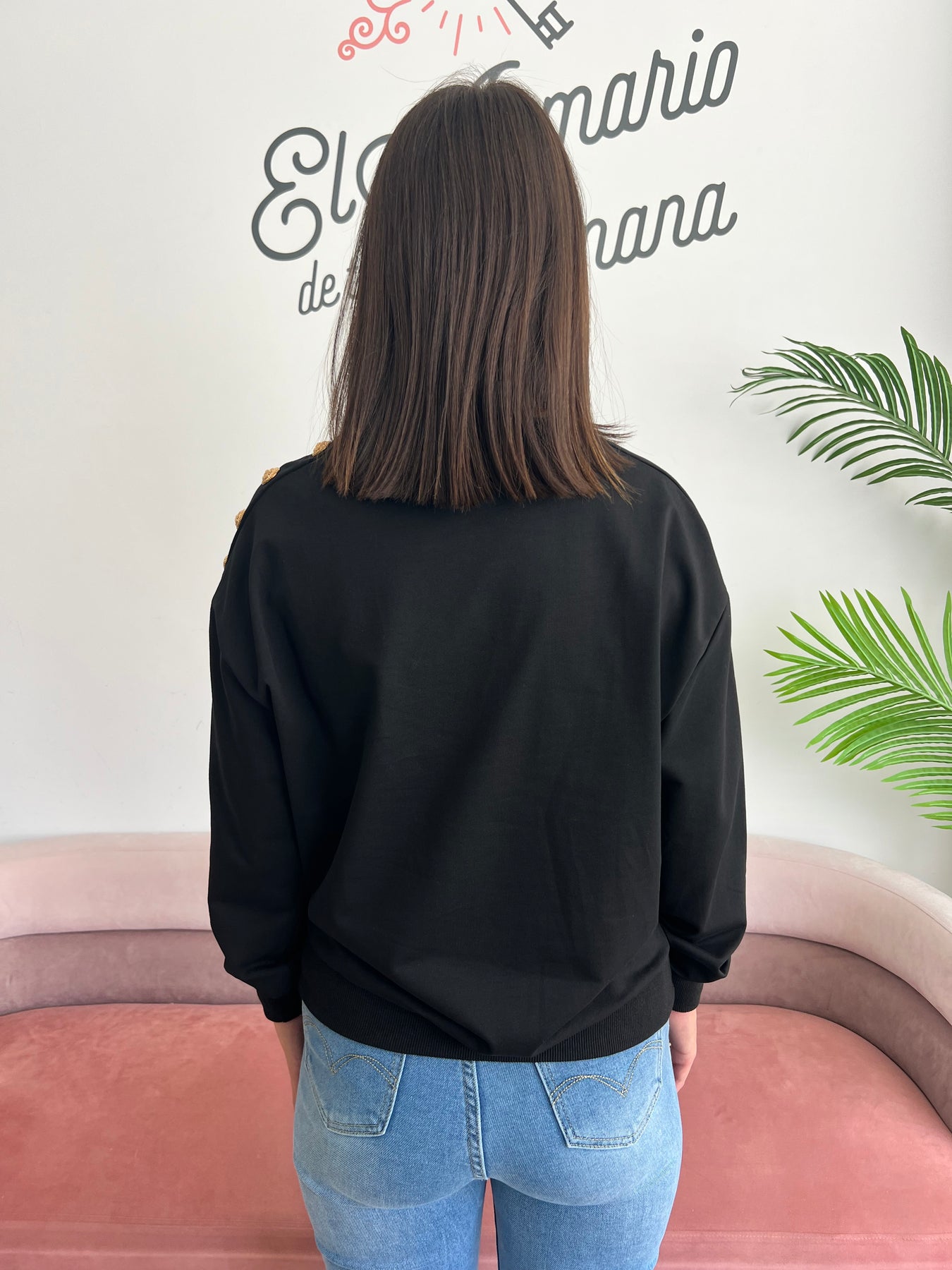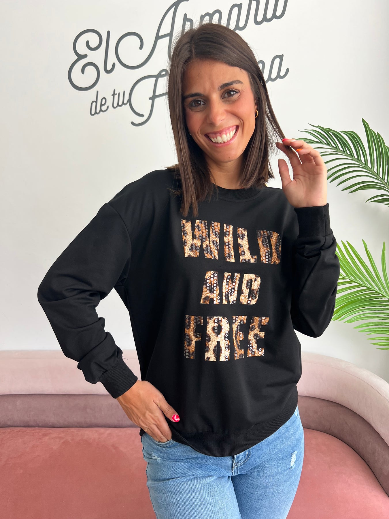 Su estampado frontal con el mensaje “WILD AND FREE” en letras animal print con lentejuelas la convierte en una pieza atrevida y con rollazo. Además, los botones decorativos en los hombros le aportan un detalle único que la hace diferente a cualquier otra sudadera.