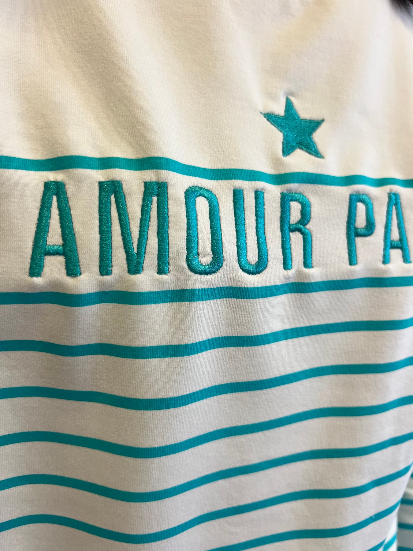 ¡Dale un toque parisino a tus looks con esta sudadera tan estilosa y cómoda! 💫 Con su diseño a rayas finas y el bordado “Amour Paris” en el pecho acompañado de una estrellita ⭐, es ideal para esos días en los que quieres ir casual pero con mucho rollo. El tejido es suave, agradable al tacto y muy gustoso de llevar 💕