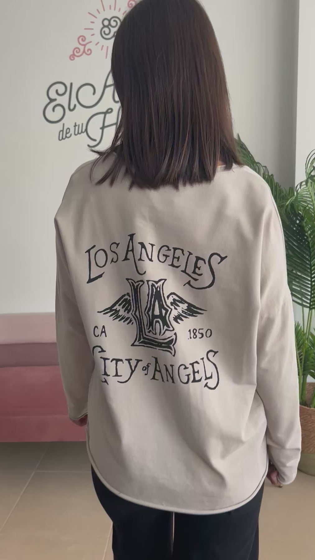 Si eres fan del estilo urbano con un toque relajado y cañero, esta sudadera va a ser tu nueva favorita. Su diseño en tono beige suave se combina con un estampado frontal minimalista y una espalda espectacular con letras estilo vintage que nos llevan directo a las calles de Los Ángeles 🚲🌆