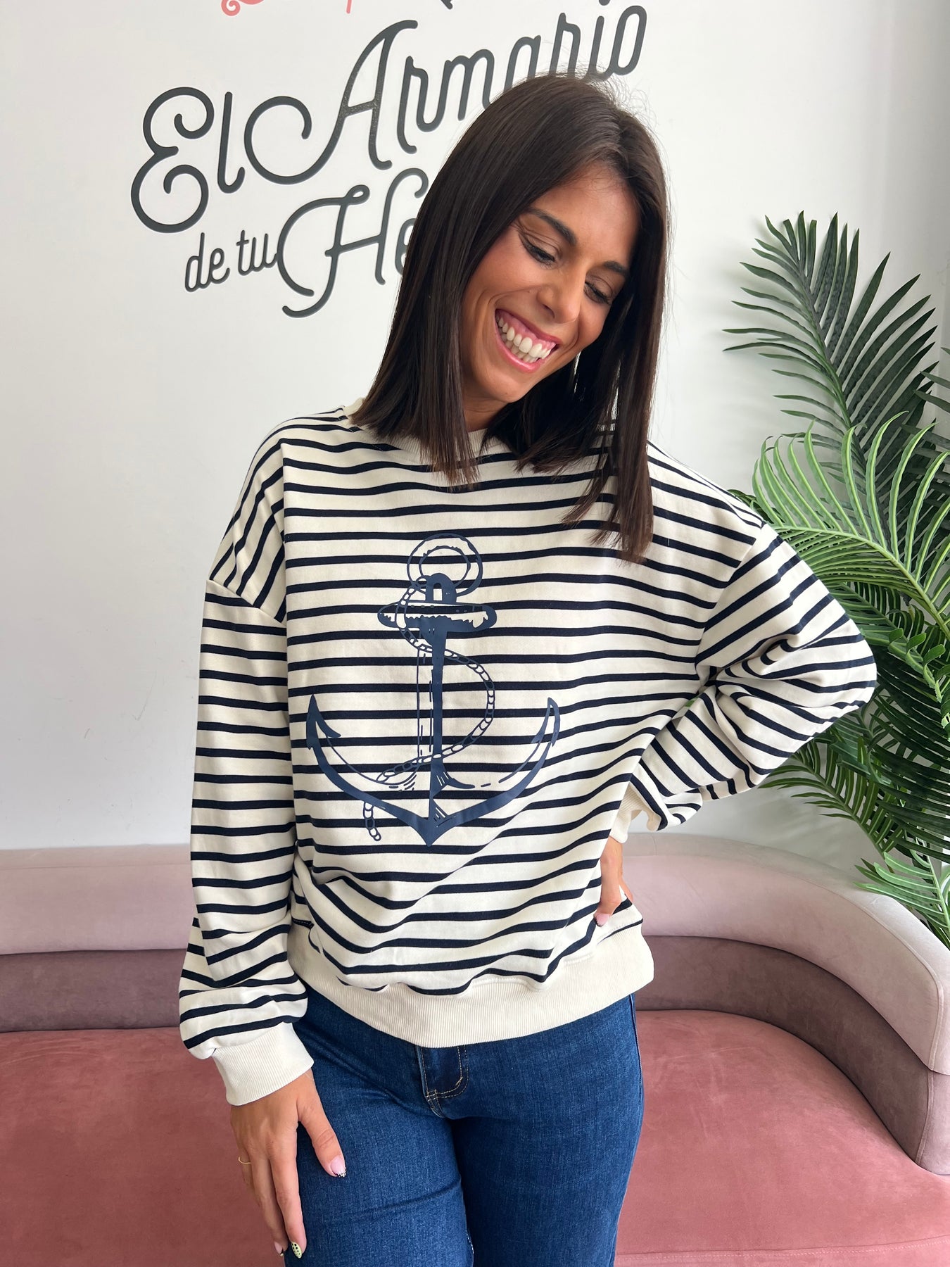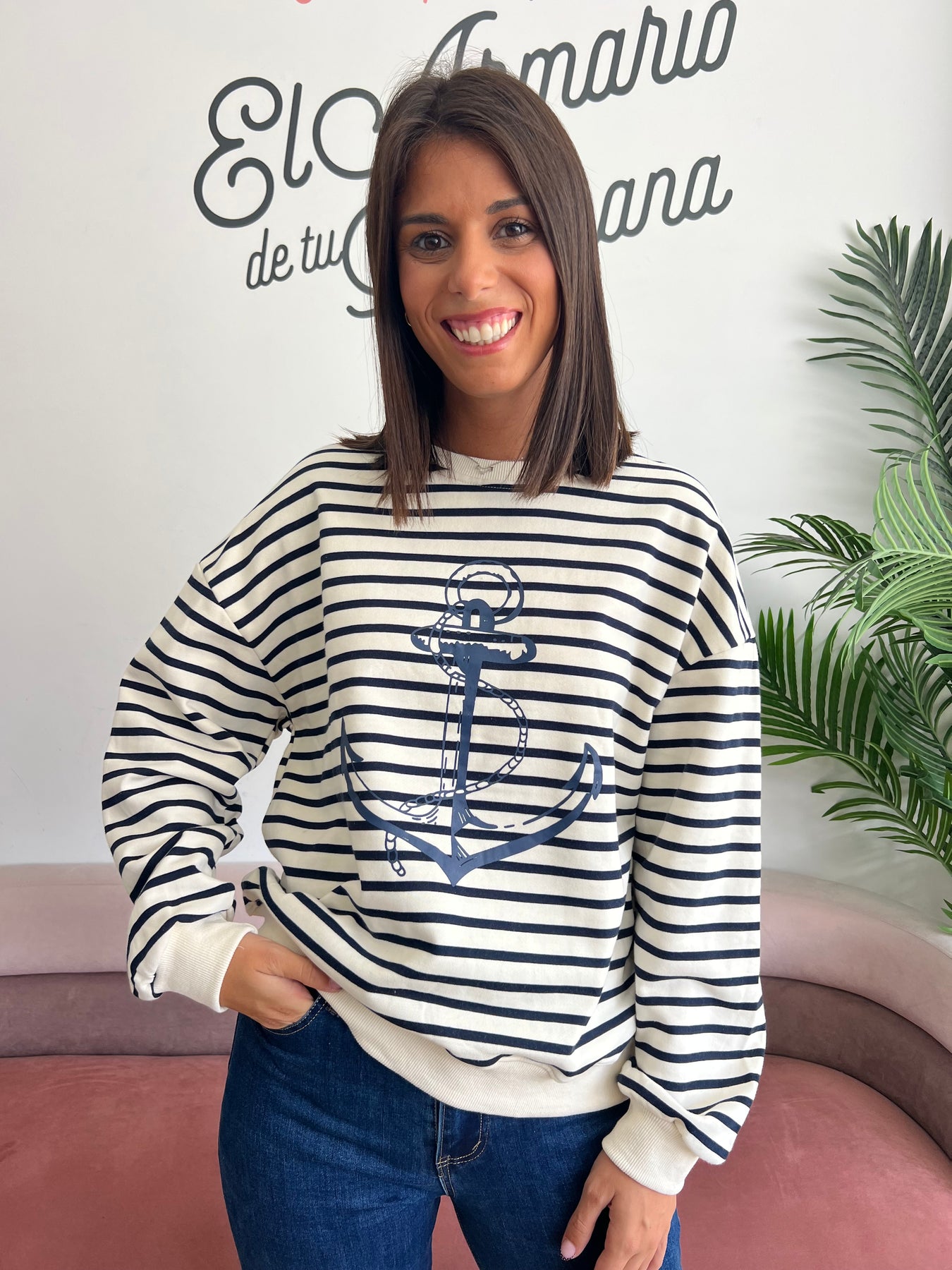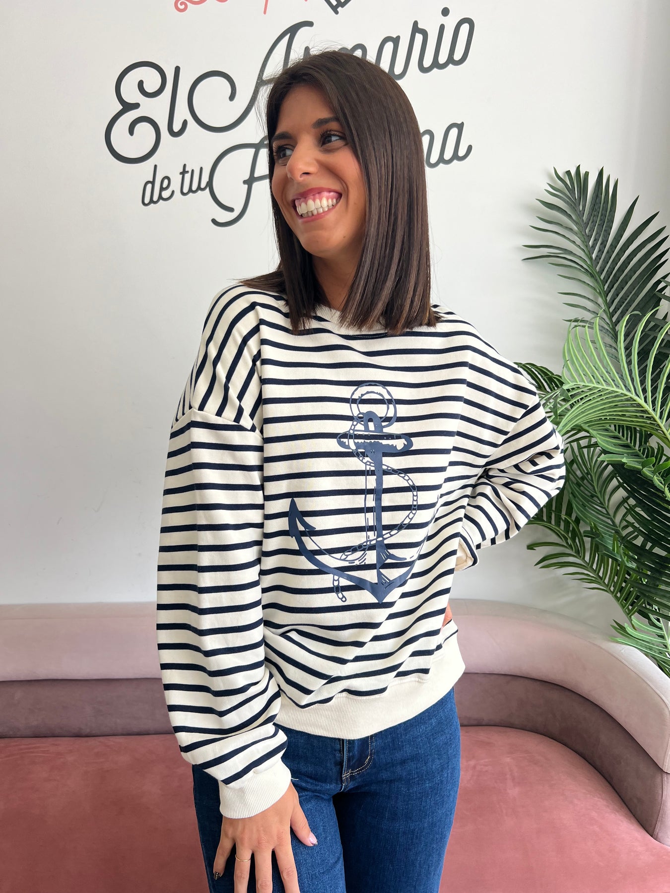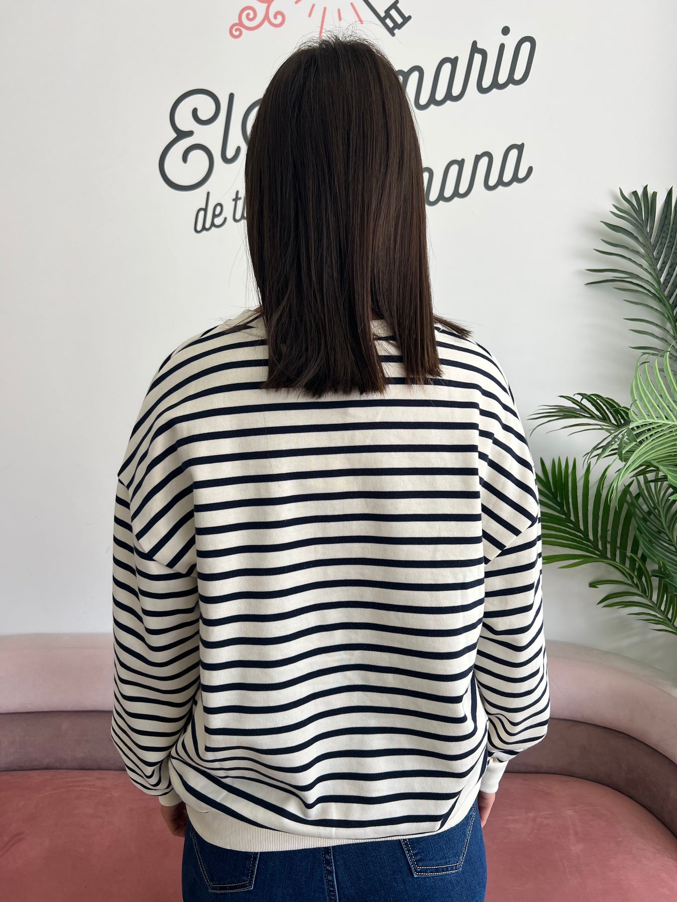 Con su diseño de rayas azul marino y blanco, esta sudadera aporta ese aire fresco y atemporal que nunca pasa de moda. Ideal para combinar tanto con vaqueros como con pantalones más arreglados, convirtiéndose en tu aliada perfecta para looks casual chic.