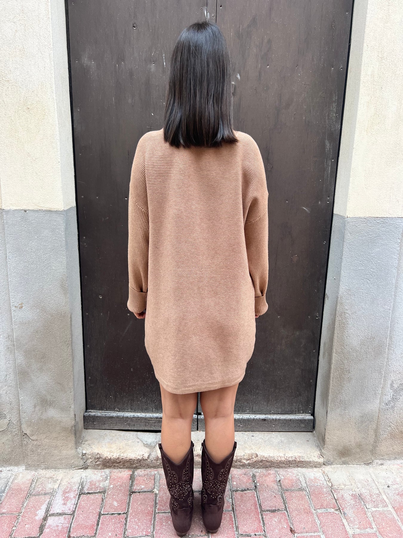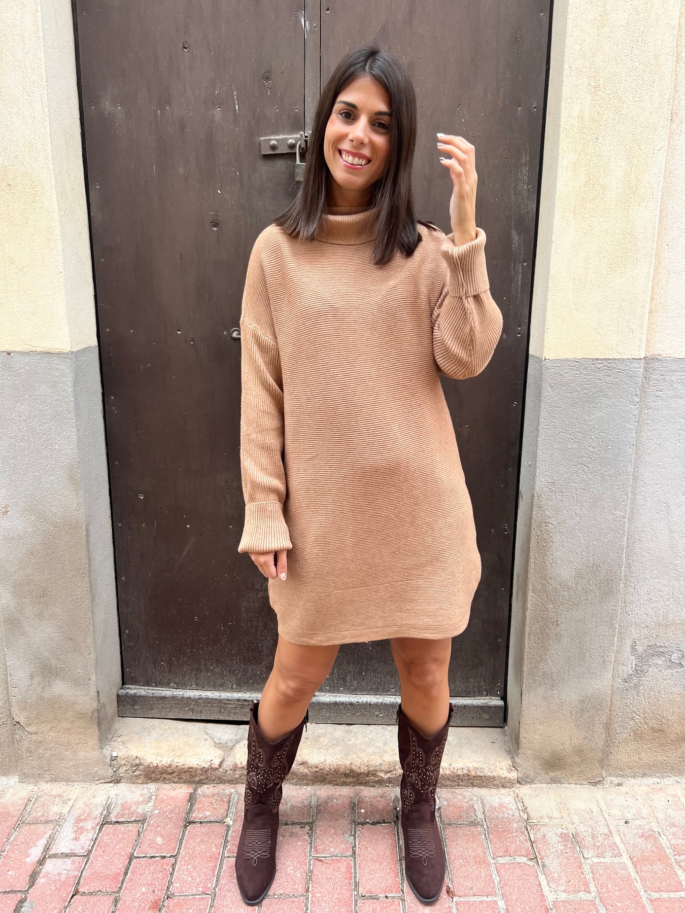 Cómodo, cálido y con un toque sofisticado, este vestido tipo jersey es esa prenda versátil que te salva cualquier look de otoño-invierno 🍂. Su diseño de punto grueso y cuello vuelto aporta abrigo sin renunciar al estilo, y su corte recto hace que siente genial sin marcar, adaptándose a diferentes tipos de cuerpo.