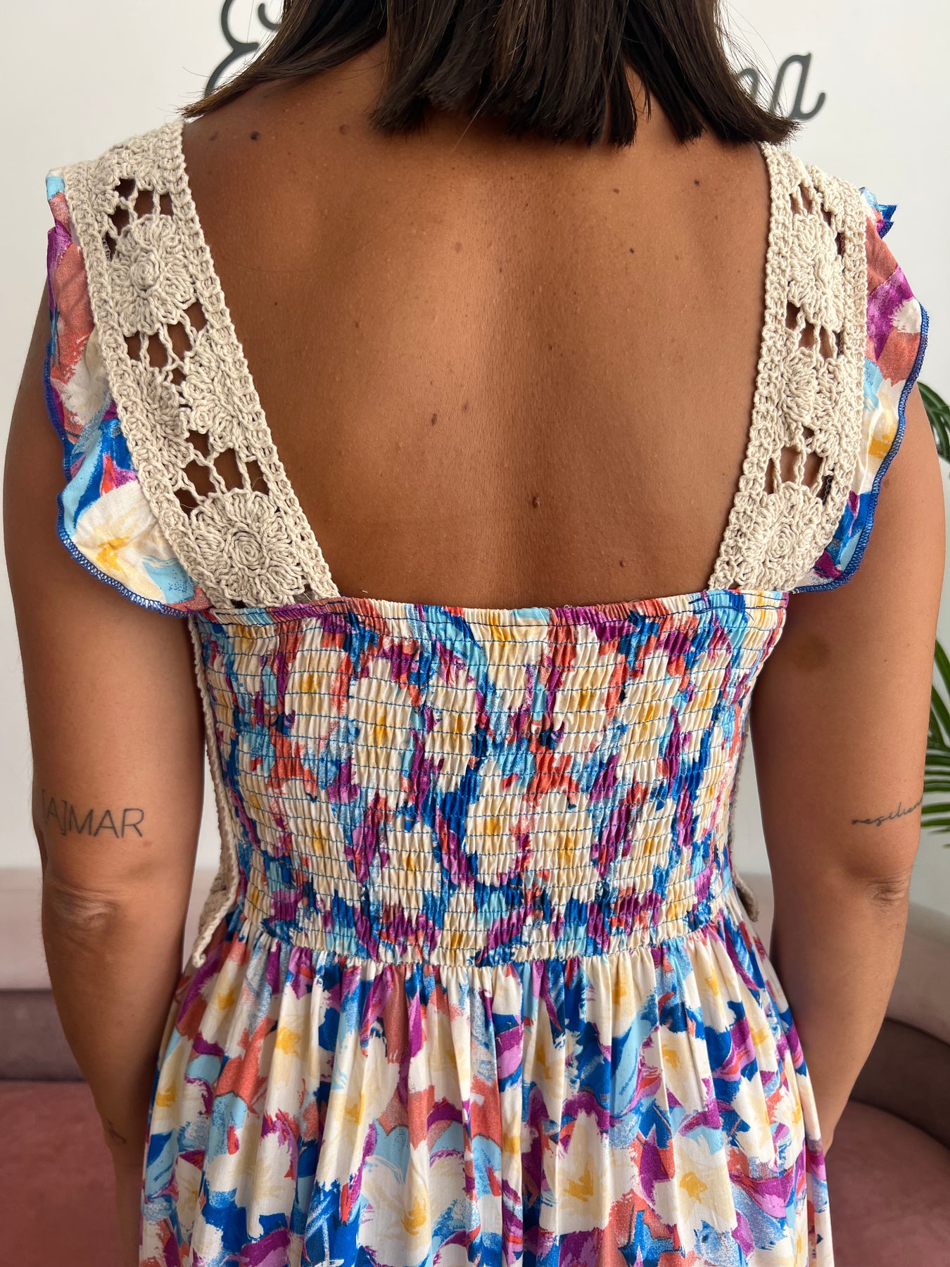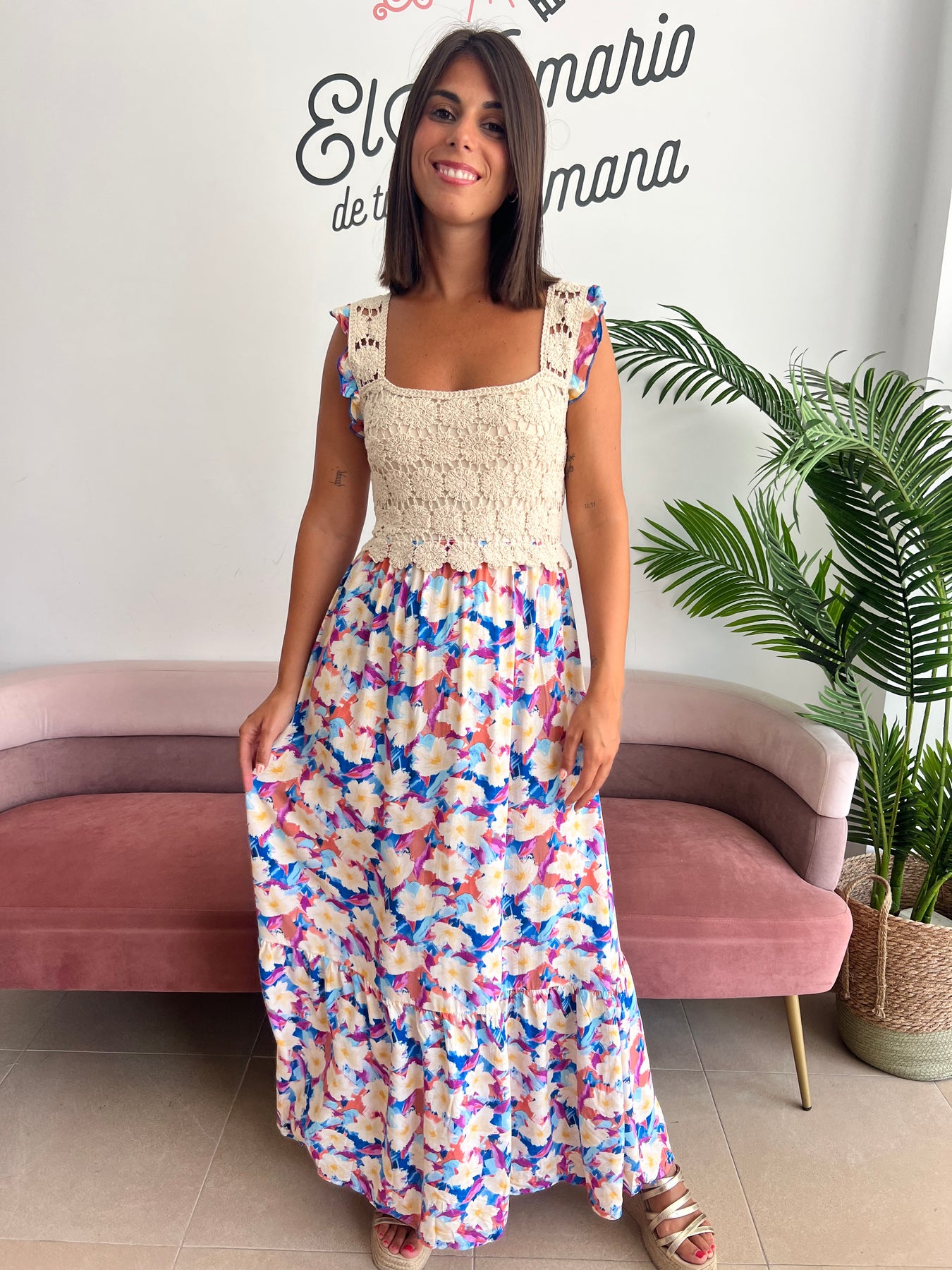 Con un cuerpo de crochet artesanal en color crudo 🤍 que se ajusta con un toque romántico y femenino, y una falda fluida de estampado floral multicolor 🌺💙💛, es la mezcla perfecta entre lo boho y lo sofisticado.