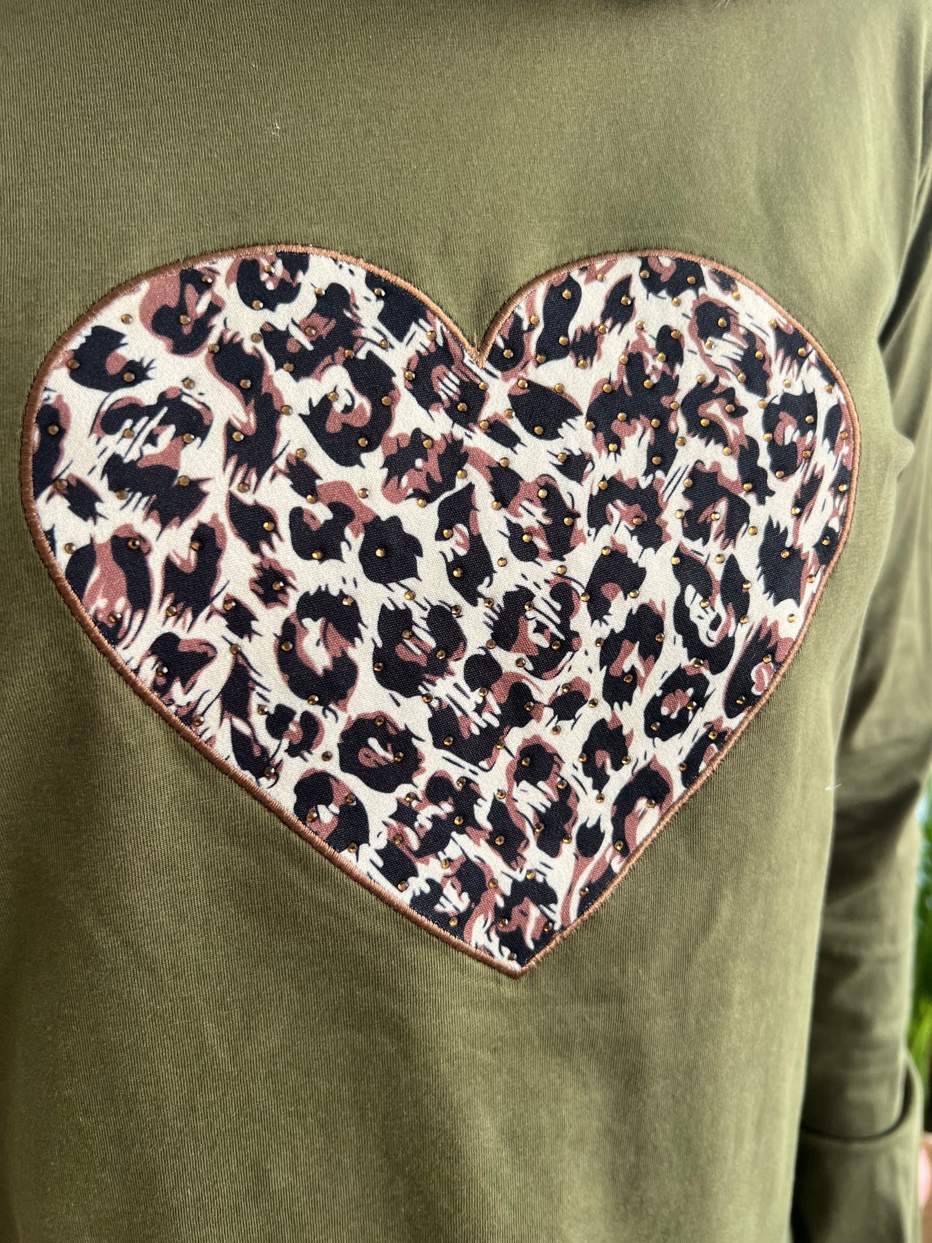 Una camiseta con personalidad, cómoda, suave y con ese toque salvaje que marca la diferencia. Su diseño con manga larga la hace ideal para entretiempo y otoño, y su protagonista indiscutible es el corazón central en tejido de estampado animal print con mini tachuelas brillantes, que le da un aire rompedor, moderno y lleno de actitud 💥.